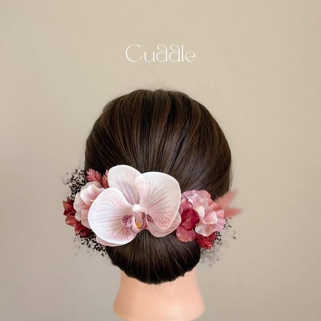 |人気再入荷商品| モーブカラーの花脈が美しい胡蝶蘭を大小2輪使用した髪飾りセットです。 愛らしさ溢れるお花にボルドーやワインの色味でほどよく引き締め、大人かわいく仕上がりました。 暖色の振袖にはもちろん、白無垢にもお似合いになります。 アーティフィシャルフラワー(高品質造花)やプリザーブドフラワーなどで製作した、cuddleオリジナルのお花の髪飾りです。 ■アーティフィシャルフラワーについて 繊細な生花に比べ、圧倒的な使い勝手の良さが特徴です。 枯れることがないため色持ちがよく、持ち運びやすいことはもちろん、cuddleでは質感や色味のリアリティも備えた高品質のお花だけを使用し、使い勝手の良さだけに留まらない、お花の美しさが映えるような髪飾りに仕上げております。 ■ひとつひとつのパーツは、セットでも単品でも使用可能です。ヘアアレンジに合わせて自由に組み合わせていただけます。 ■お花の褪色や劣化を最小限に抑えるために、直射日光の当たらない、風通しの良い日陰での保管をおすすめいたします。 ■ヘアアレンジにご使用の後も、小さな花瓶などに刺してインテリアとしてもご利用いただけます。