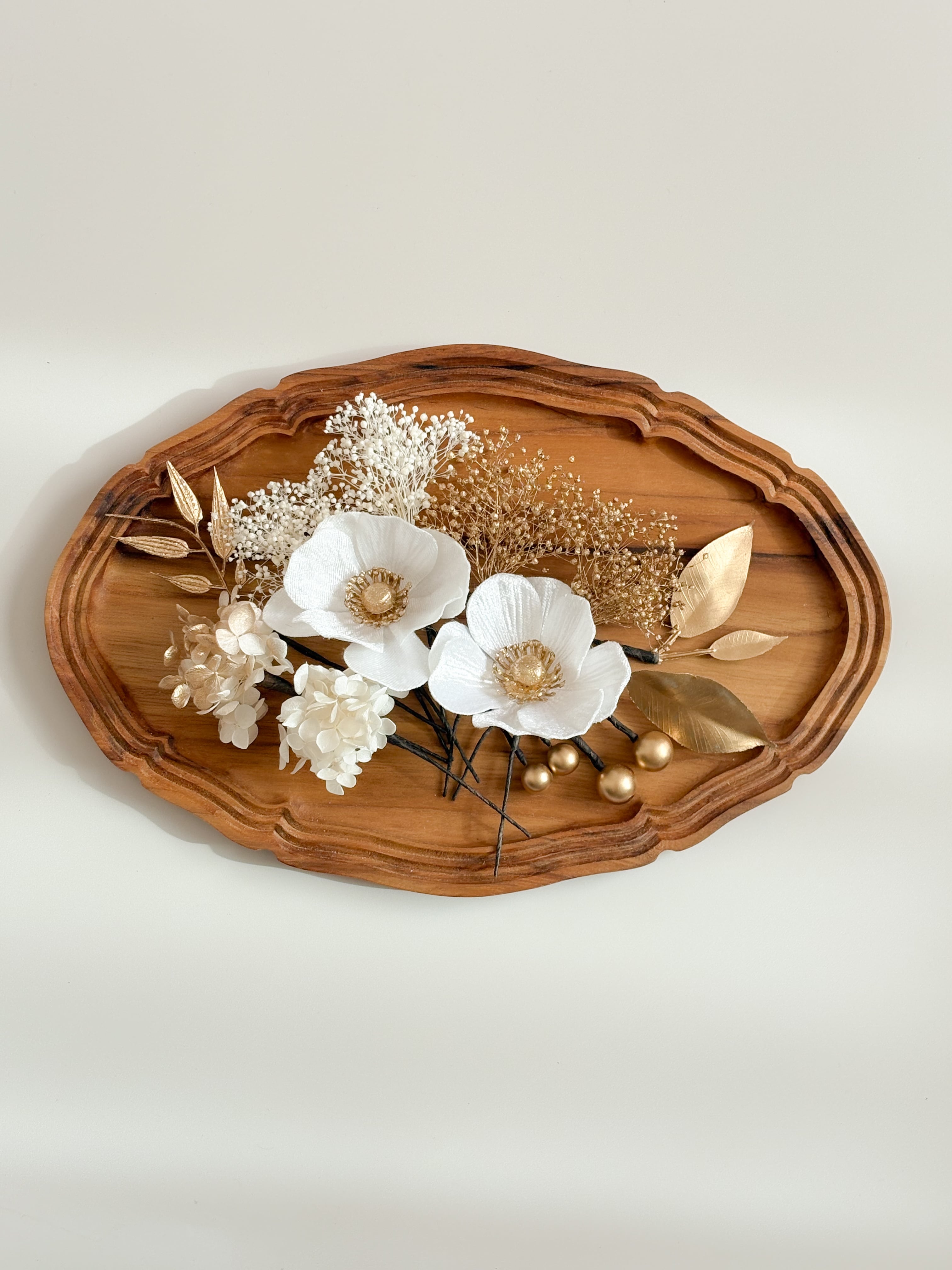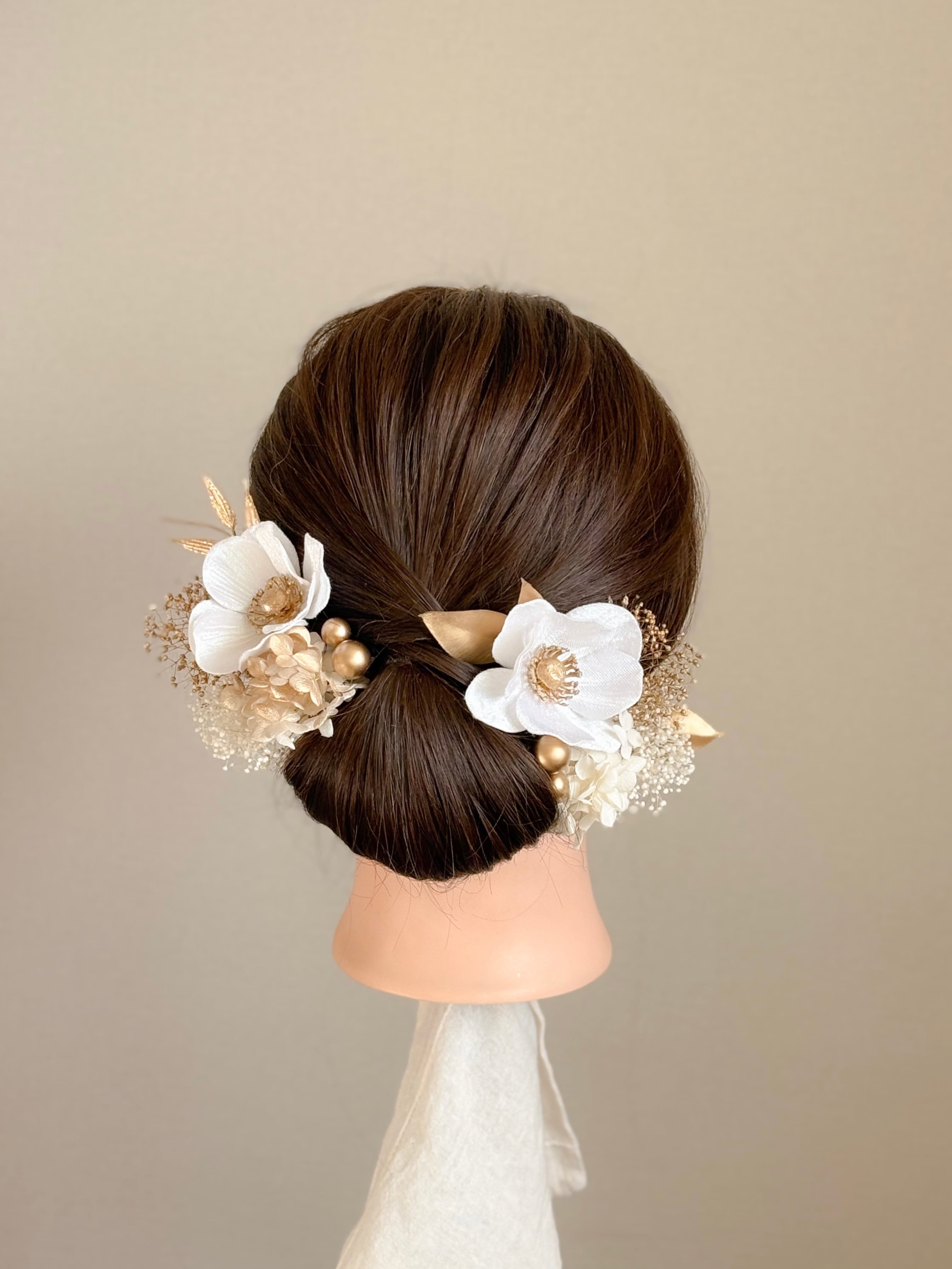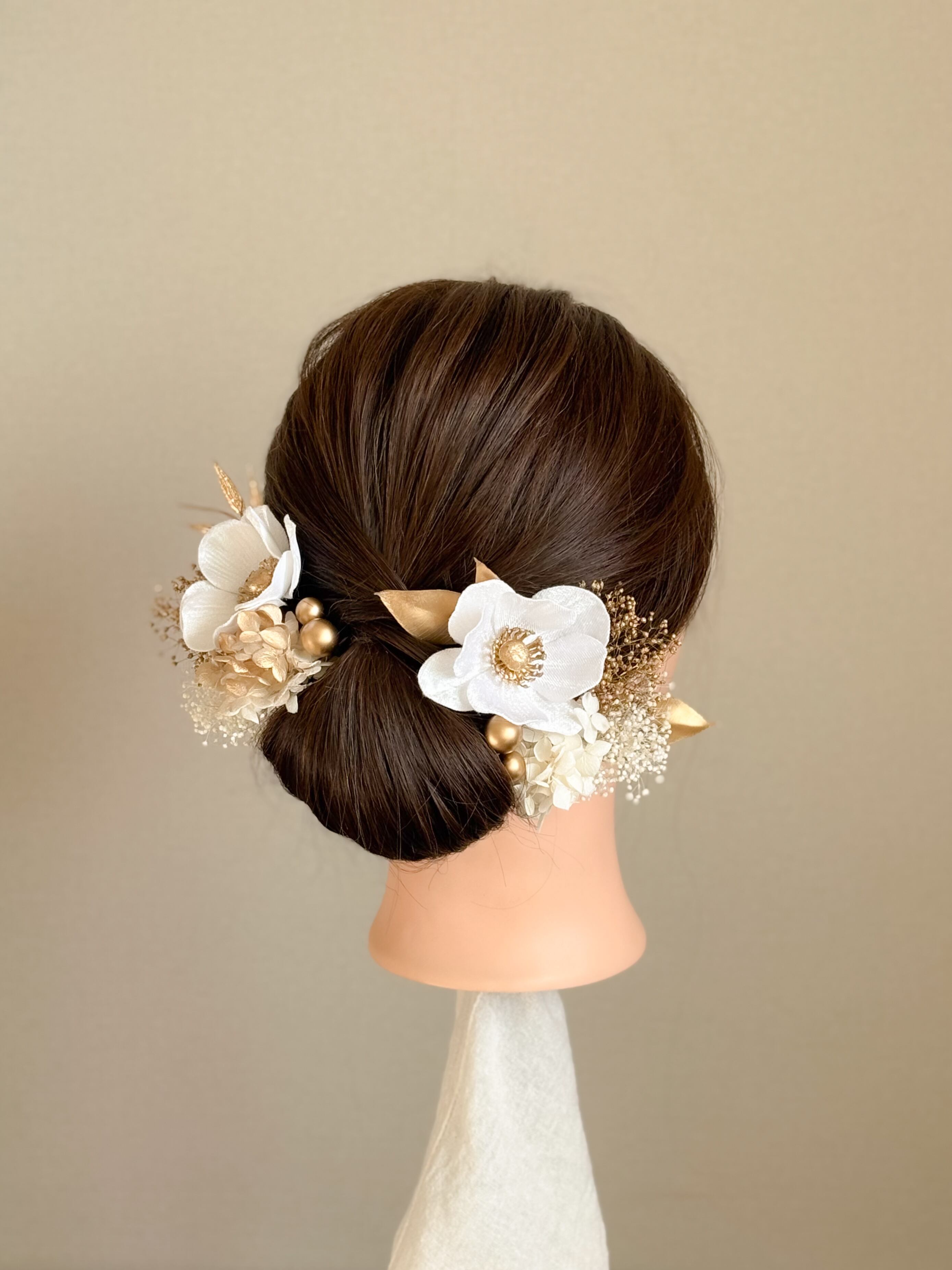 ベルベット調が美しいホワイトのアネモネ2輪をメインに使用した、この季節にぴったりの髪飾りです。
