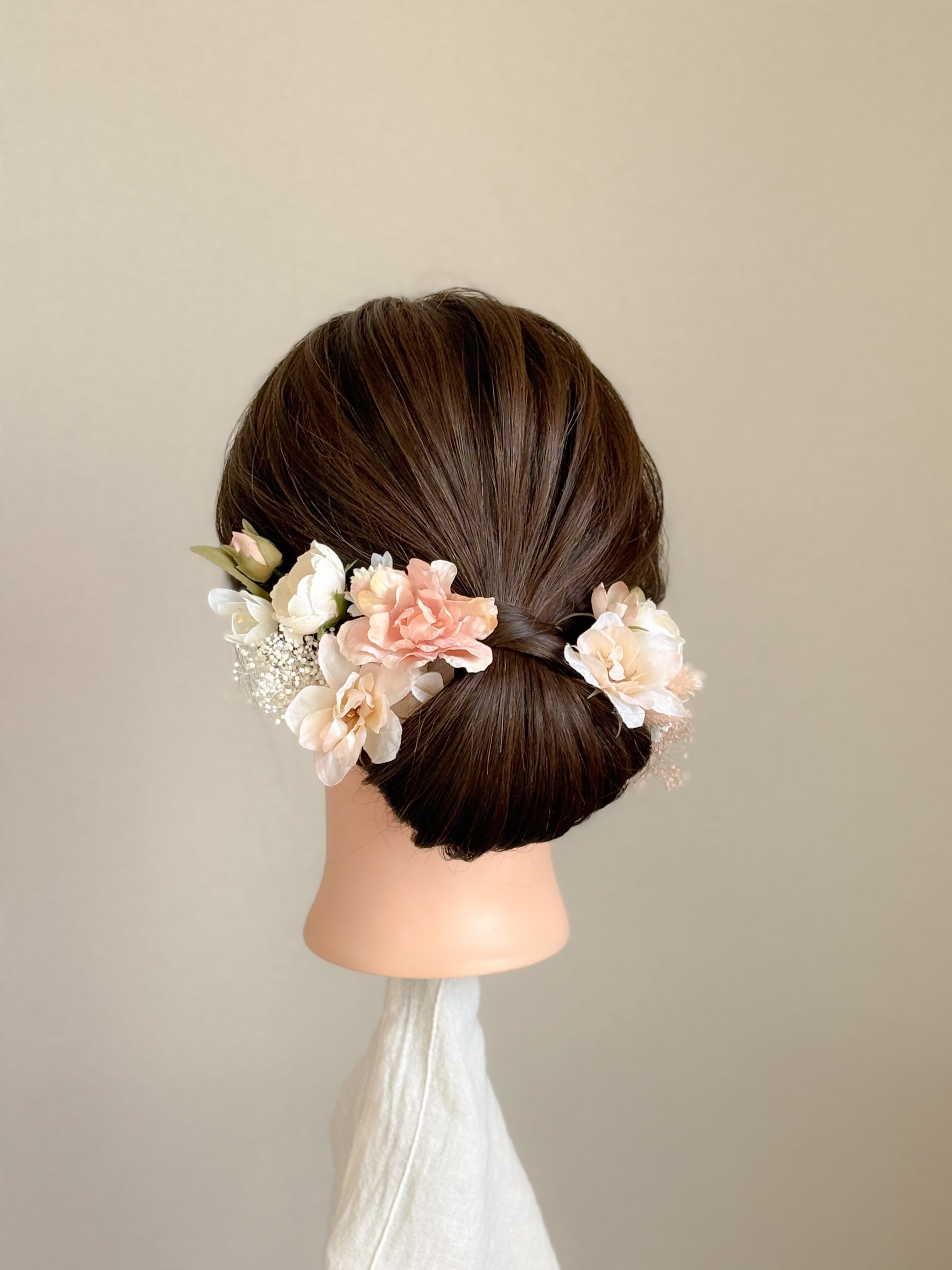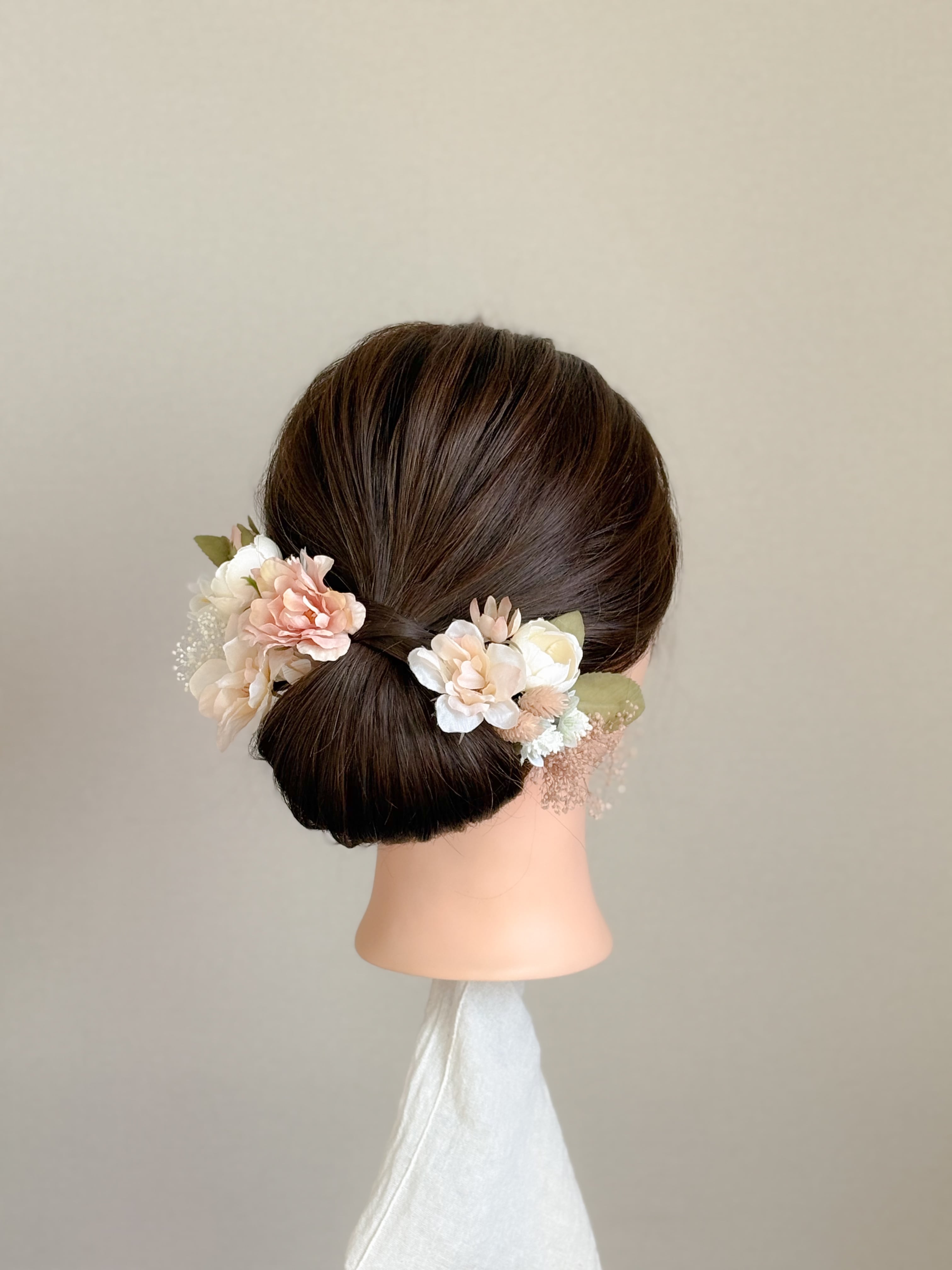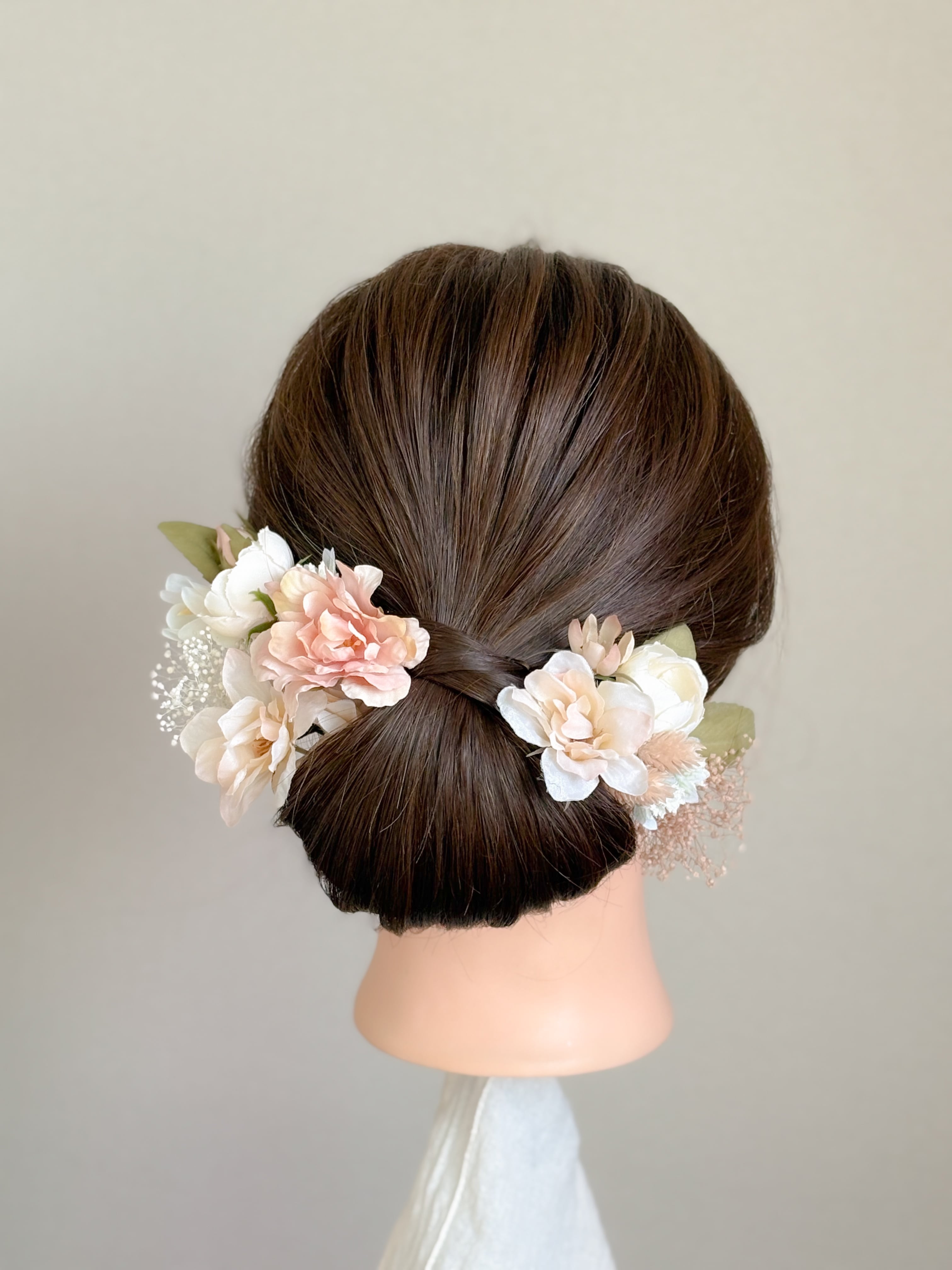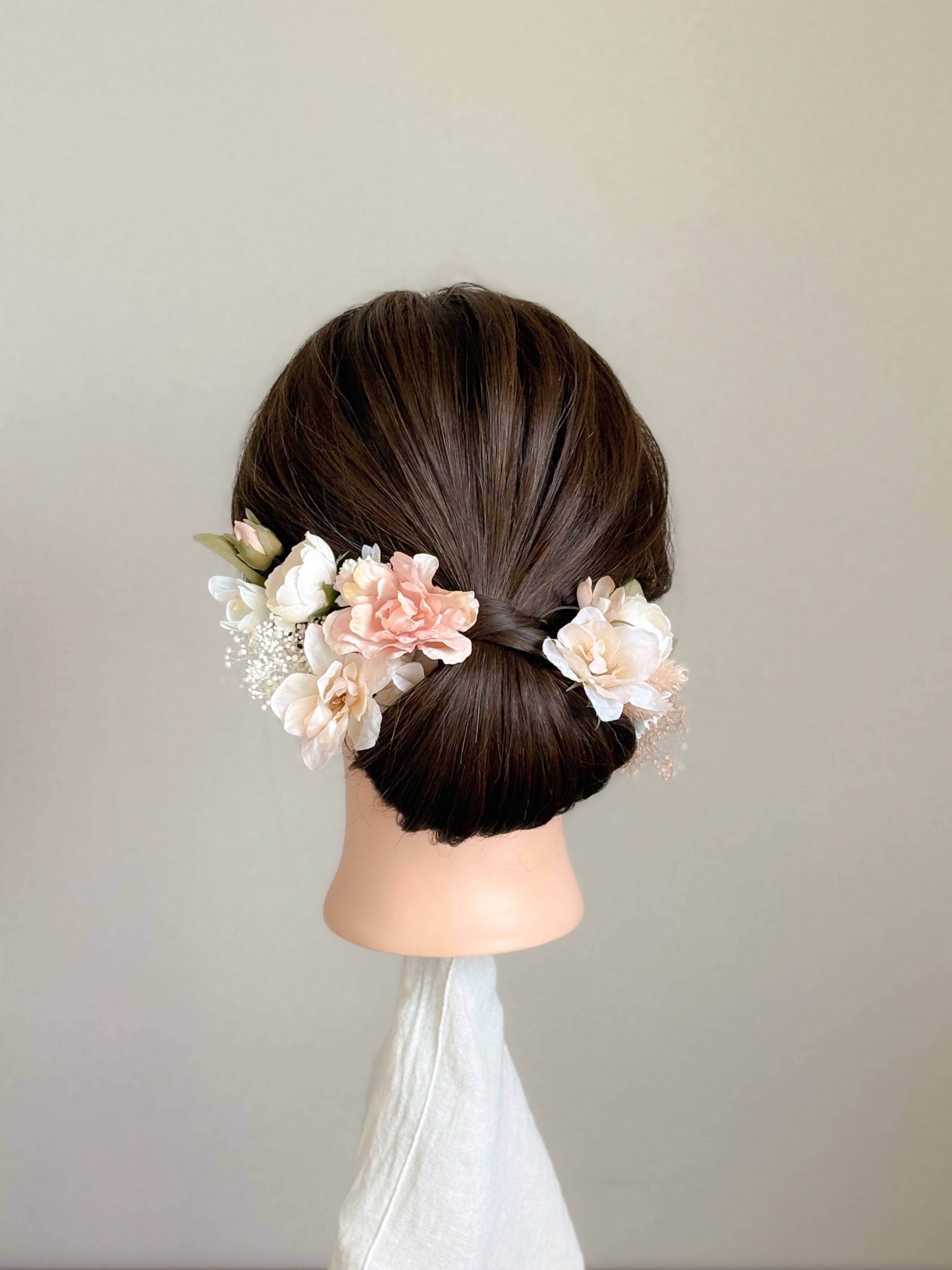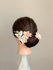 写真のようにパーツをまとめてぎゅっとお付けするスタイルのほか、ヘアアレンジのところどころに少量ずつちりばめるような着用スタイルも愛らしさの出るおすすめアレンジです。