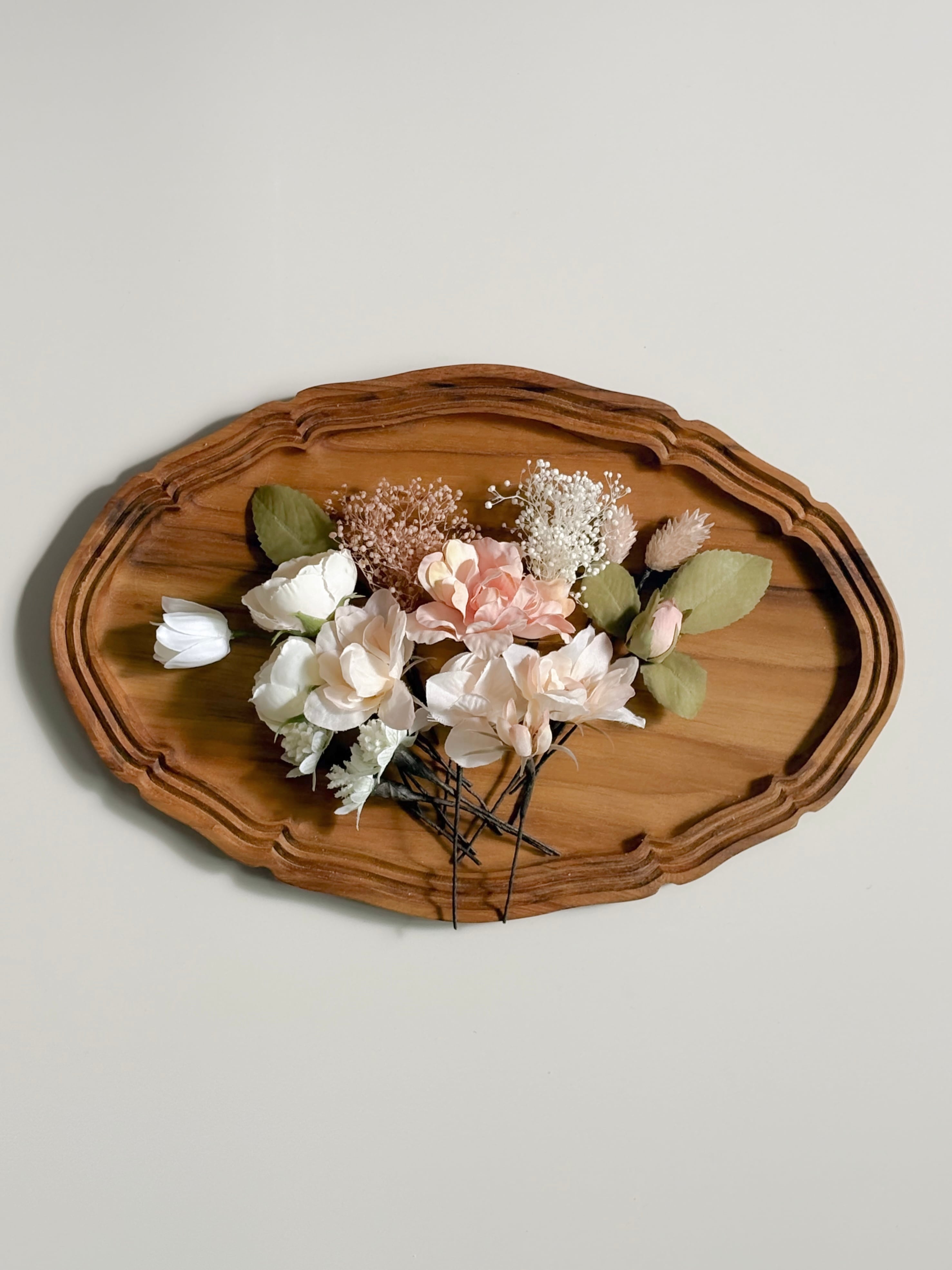 お庭で摘んできたような優しいピンクやホワイトのお花たちをぎゅっと詰め込んだ髪飾りセットです。