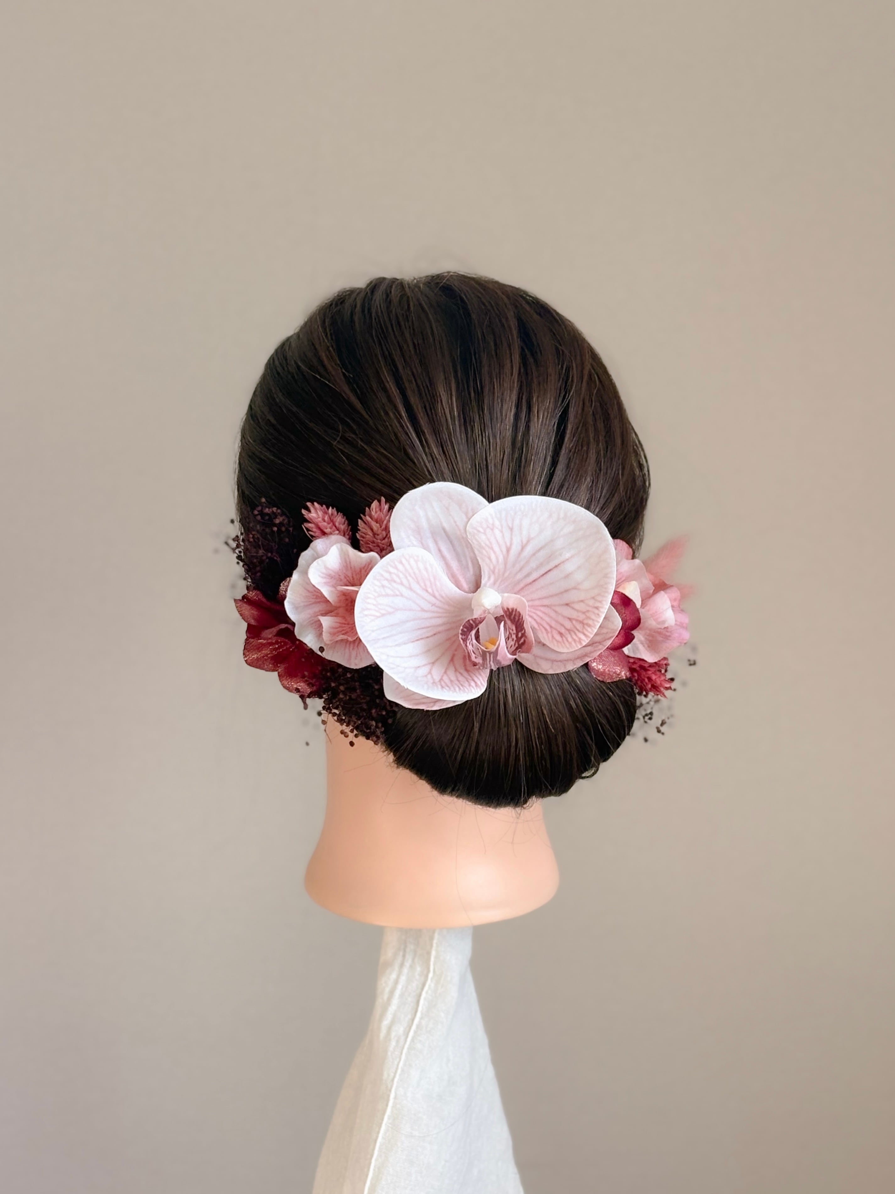 ホワイトにモーブカラーの花脈が美しい、凛とした胡蝶蘭をメインとした髪飾りセットです。