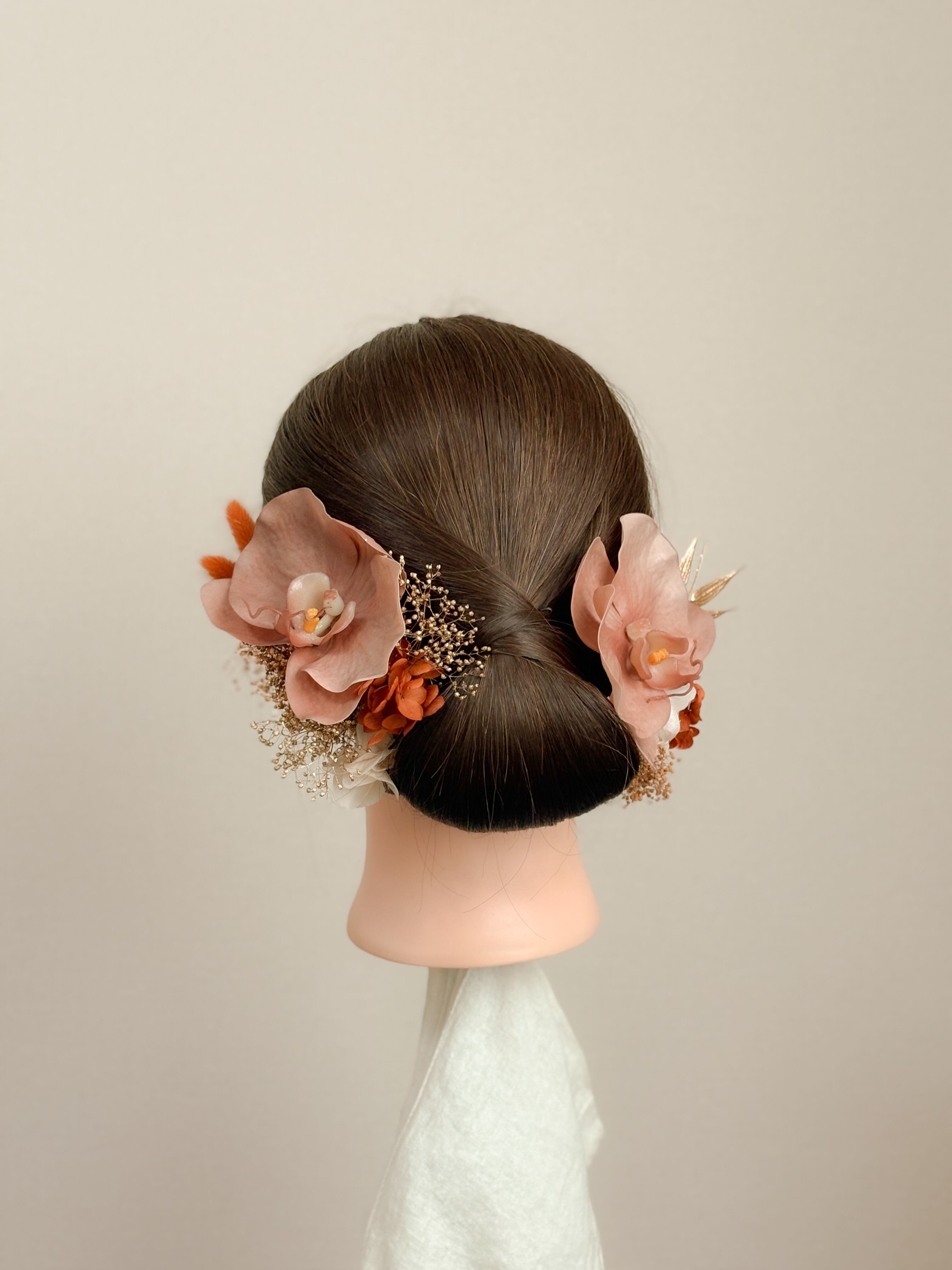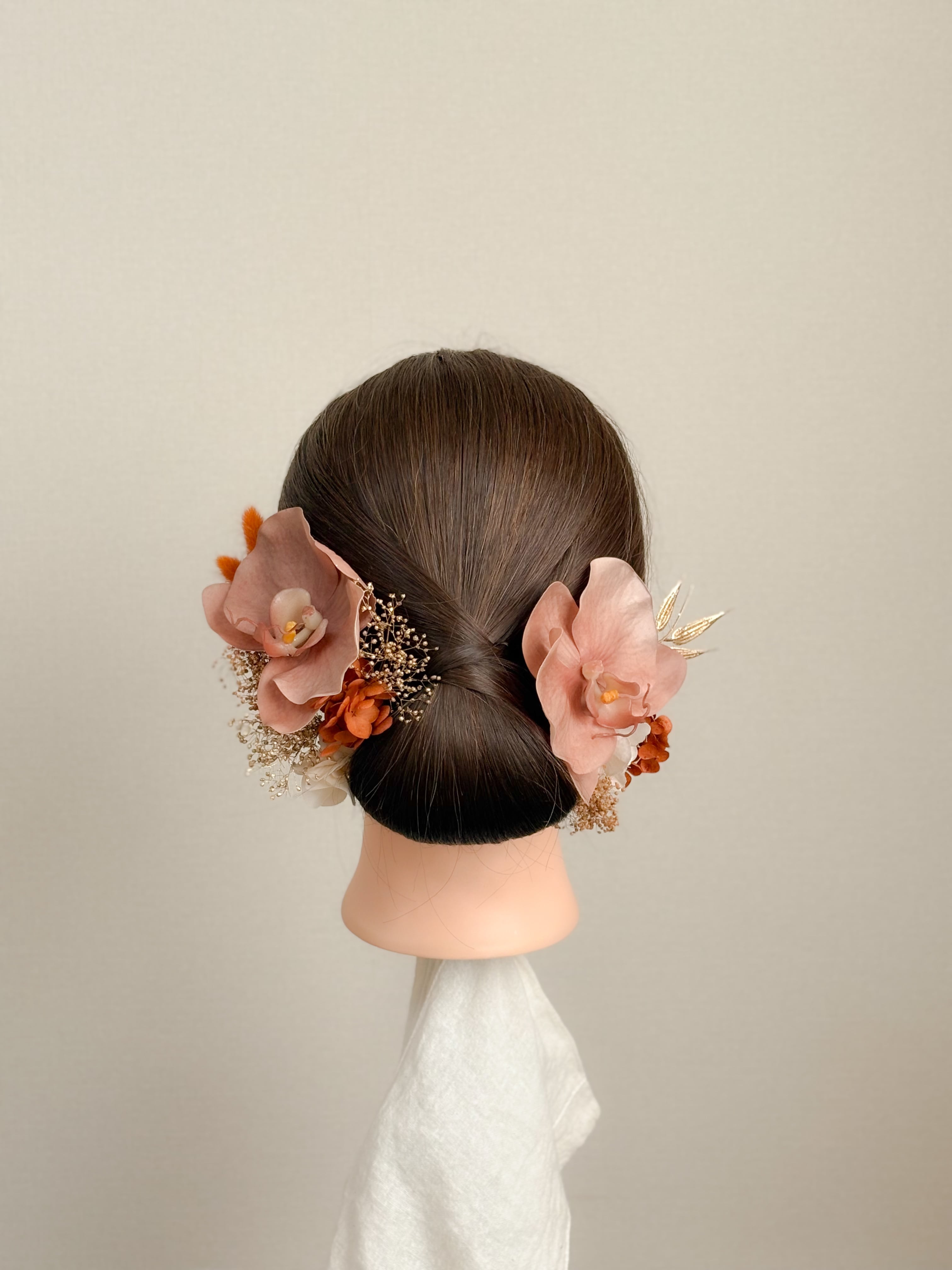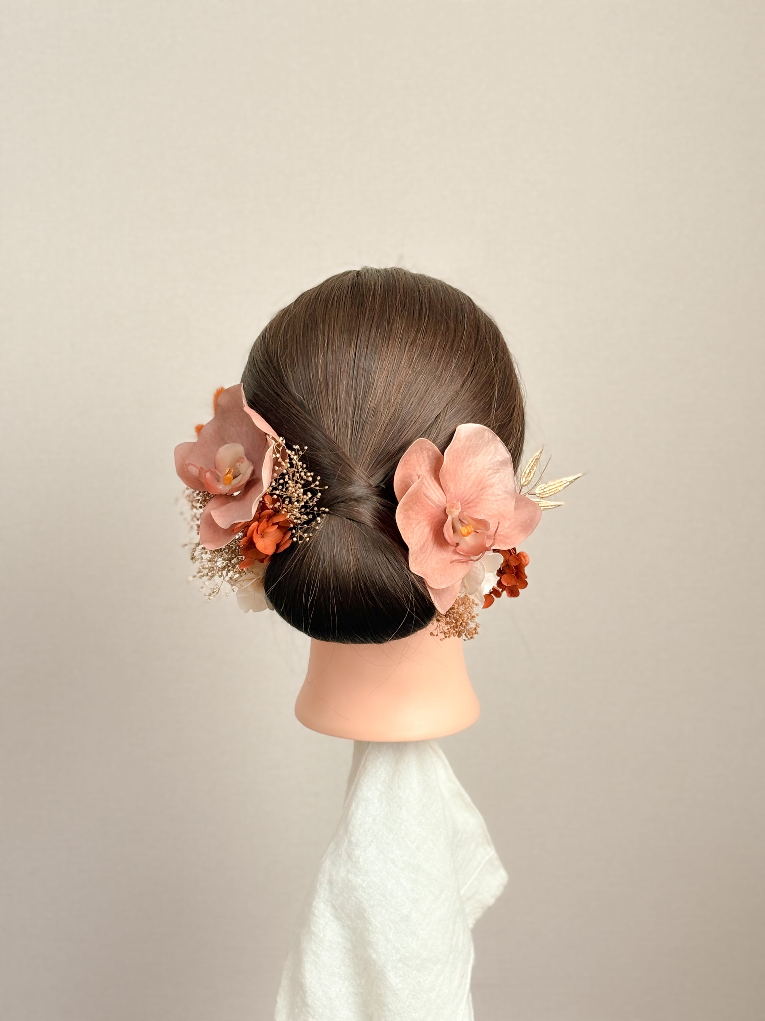 くすんだラストカラーが上品な胡蝶蘭2輪がメインの髪飾りセットです。