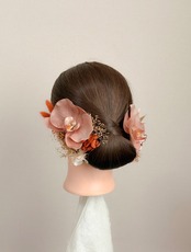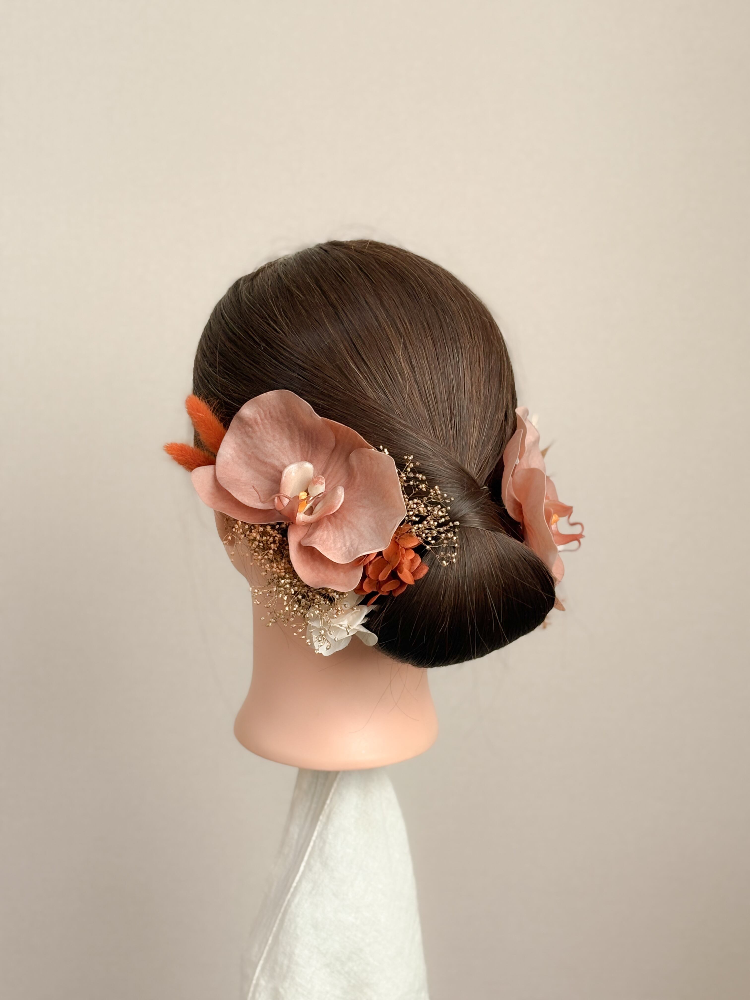 テラコッタカラーのアジサイやラグラス、ゴールドのリーフやかすみ草など、温かみがありながら洗練された印象のヘアアレンジが決まります。