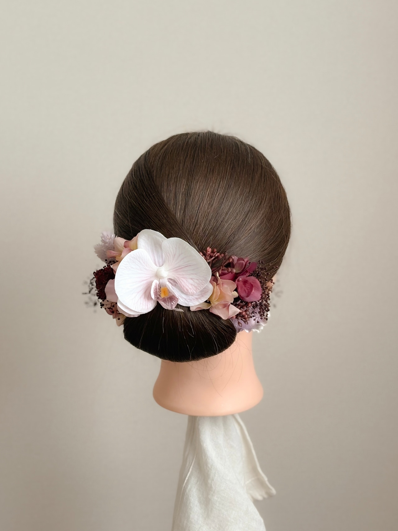胡蝶蘭は大きすぎず小さすぎず、絶妙な存在感でヘアアレンジを引き立たせます。