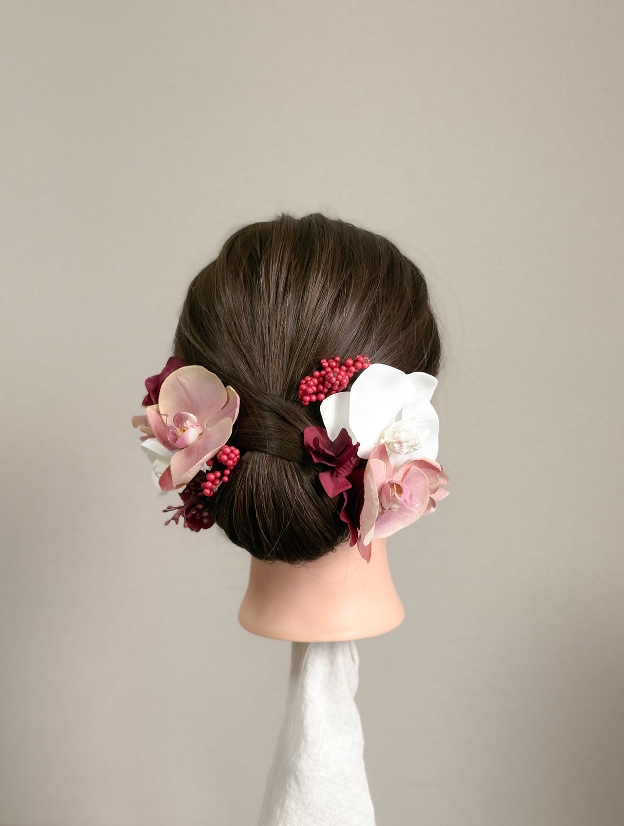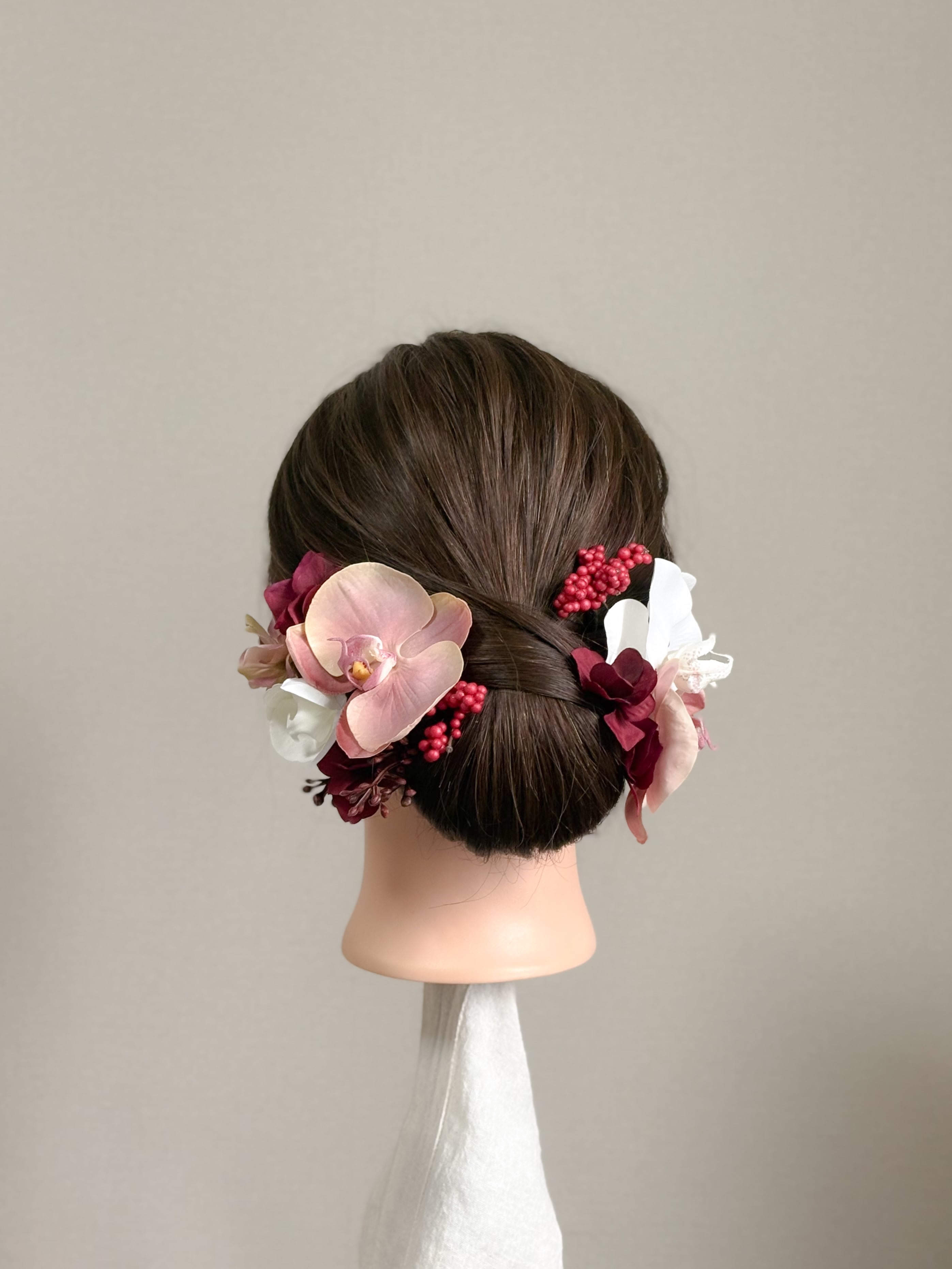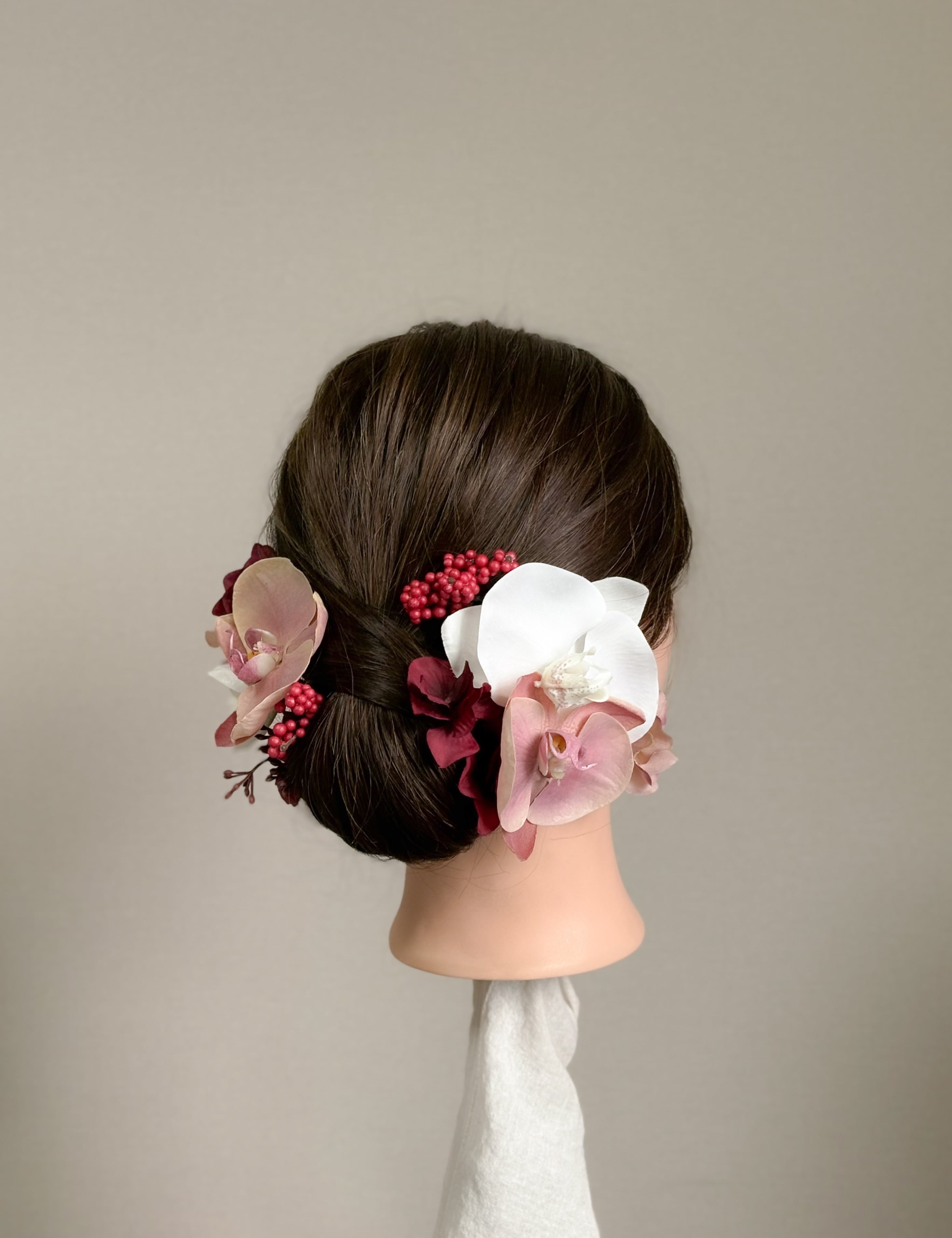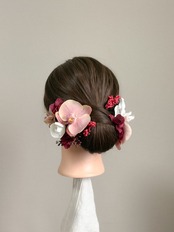 小ぶりな胡蝶蘭を贅沢に3輪使用した、華やかな髪飾りセットです。