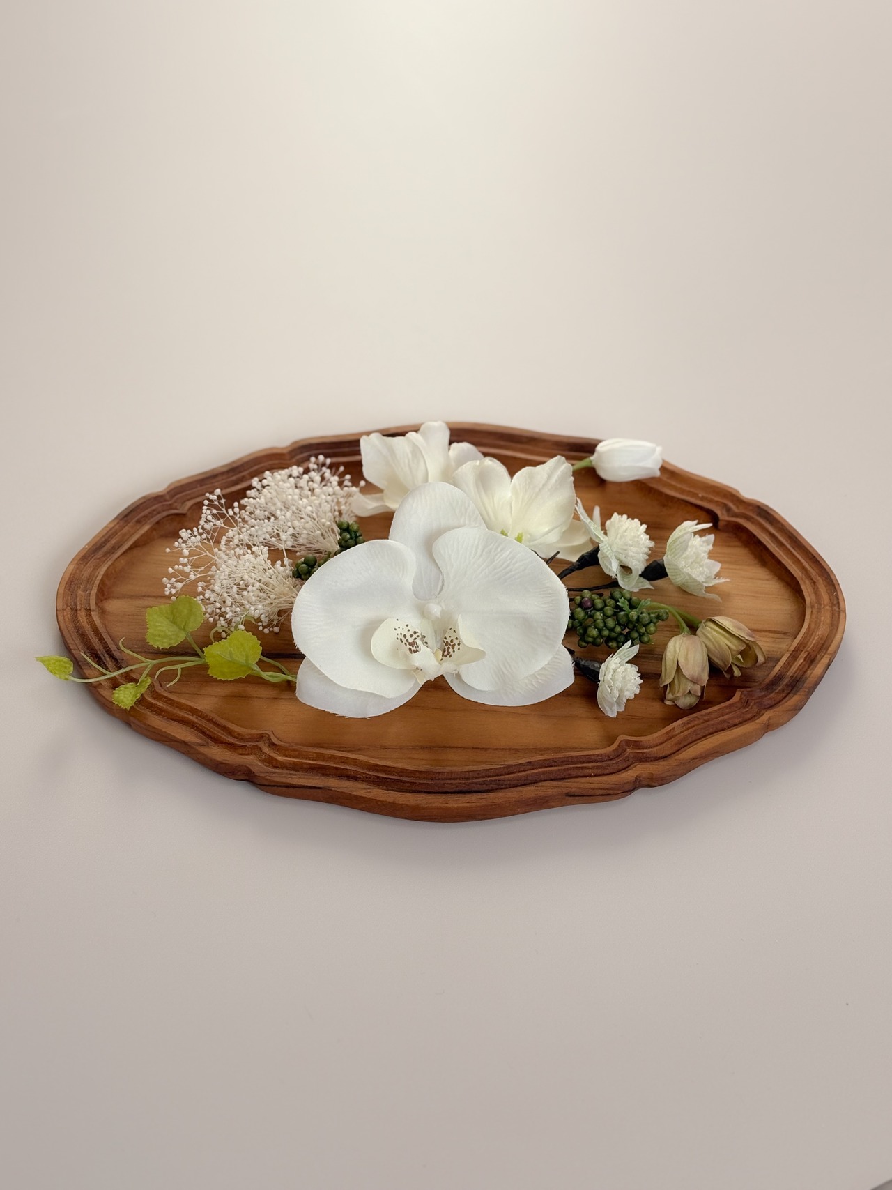 胡蝶蘭のほかフリチラリアやデルフィニウムなどさまざまな種類のお花、実もの、葉ものをバランスよくまとめ、立体感のある凛とした印象の髪飾りです。