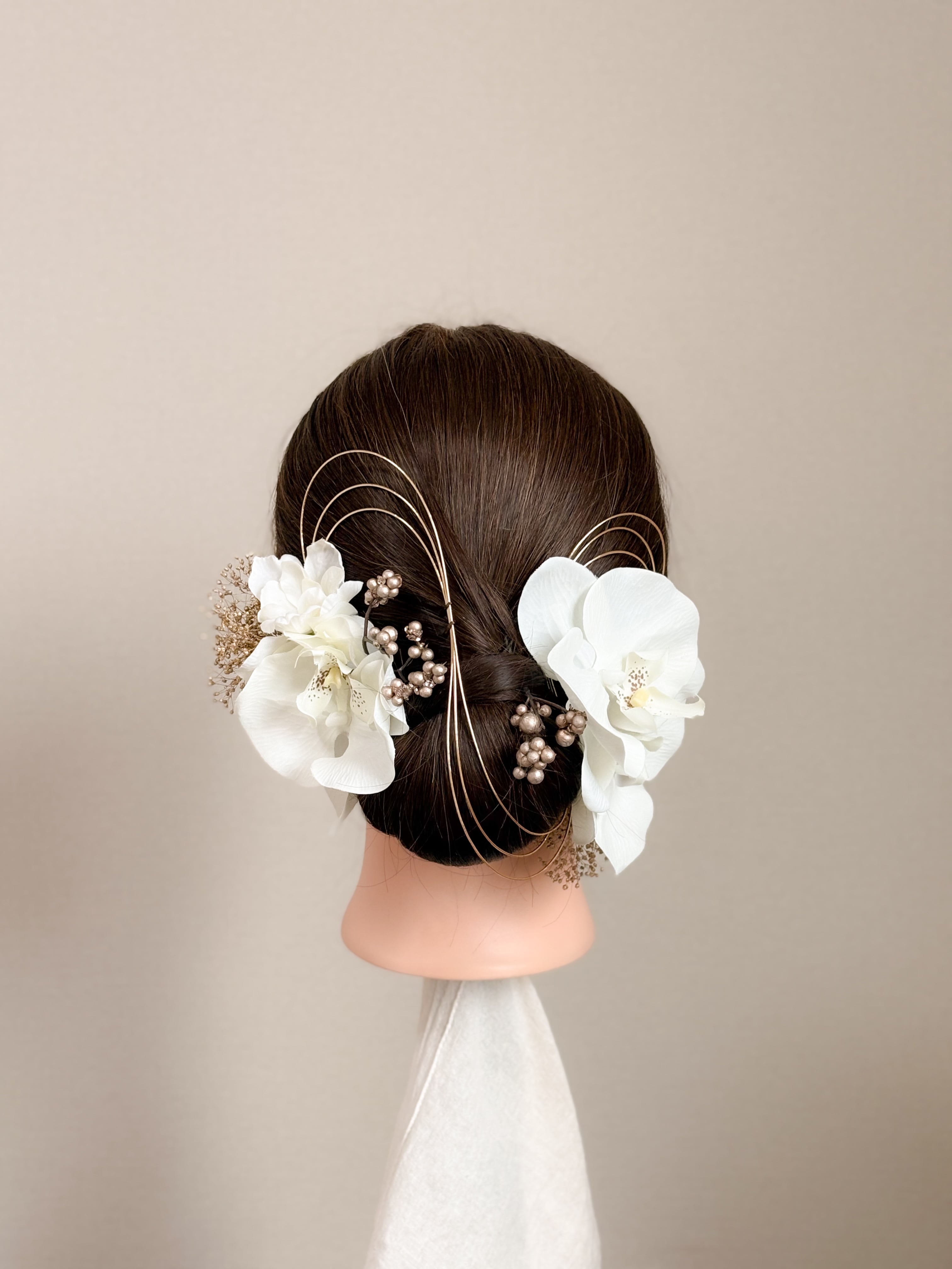 枯れることがないため色持ちがよく、持ち運びやすいことはもちろん、cuddleでは質感や色味のリアリティも備えた高品質のお花だけを使用し、使い勝手の良さだけに留まらない、お花の美しさが映えるような髪飾りに仕上げております。