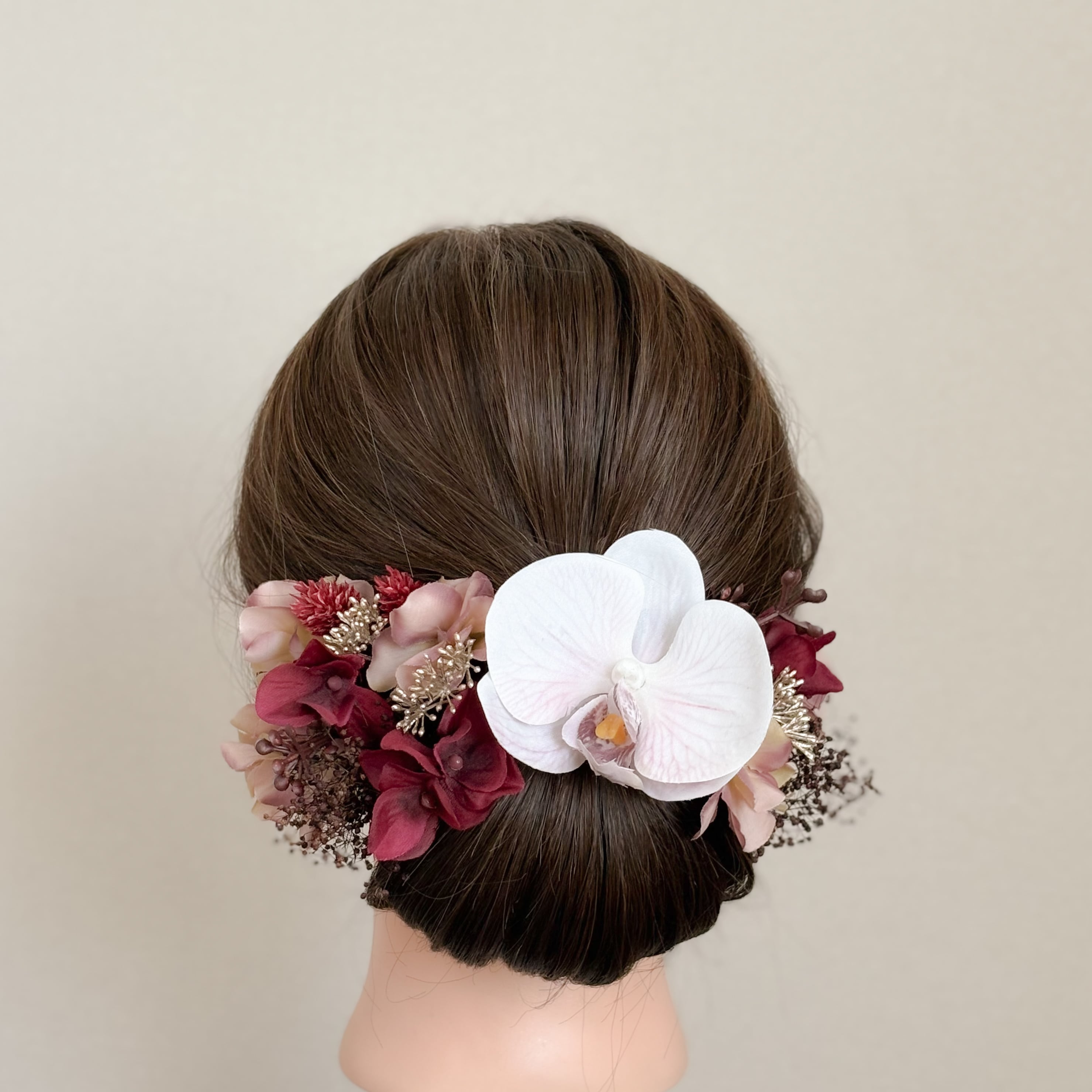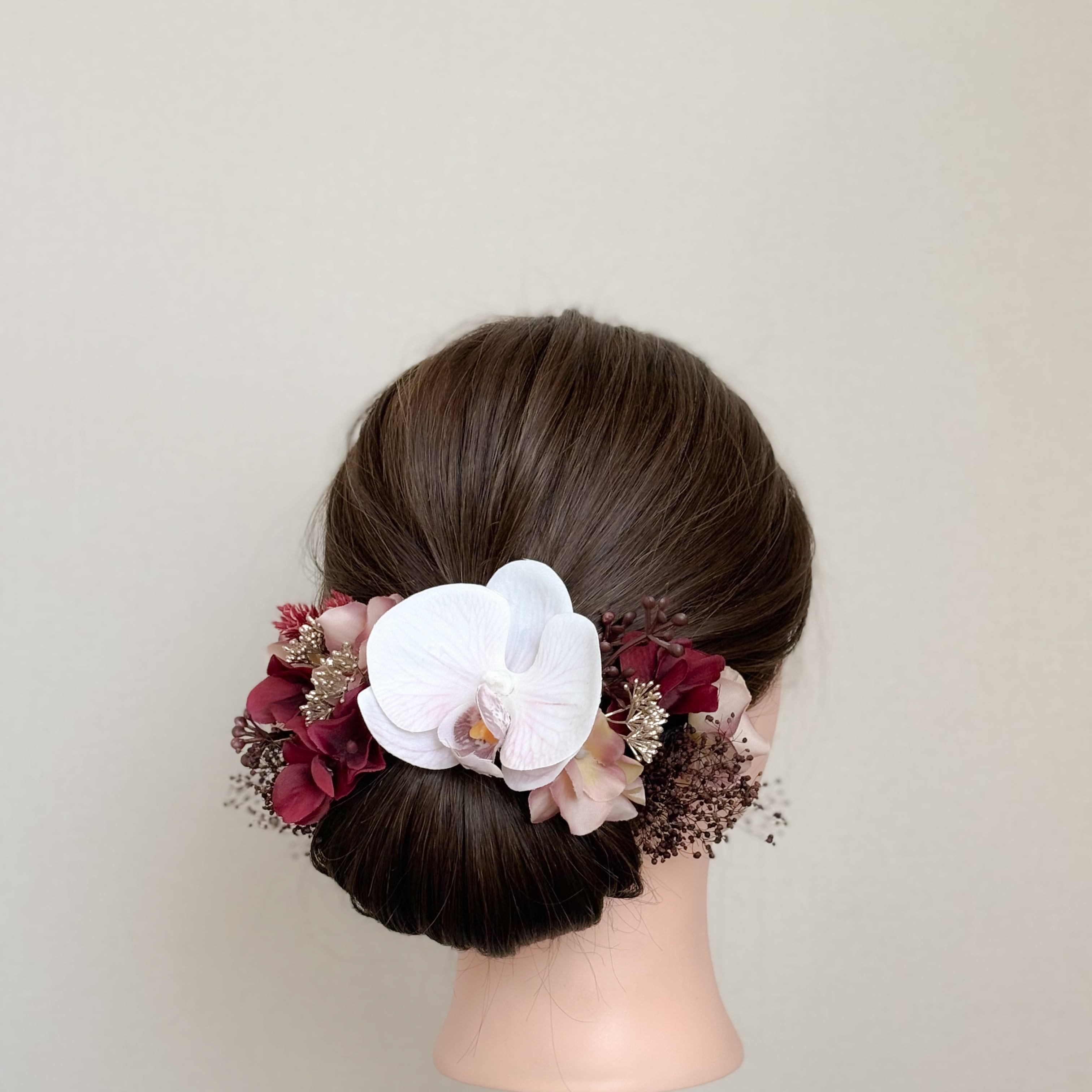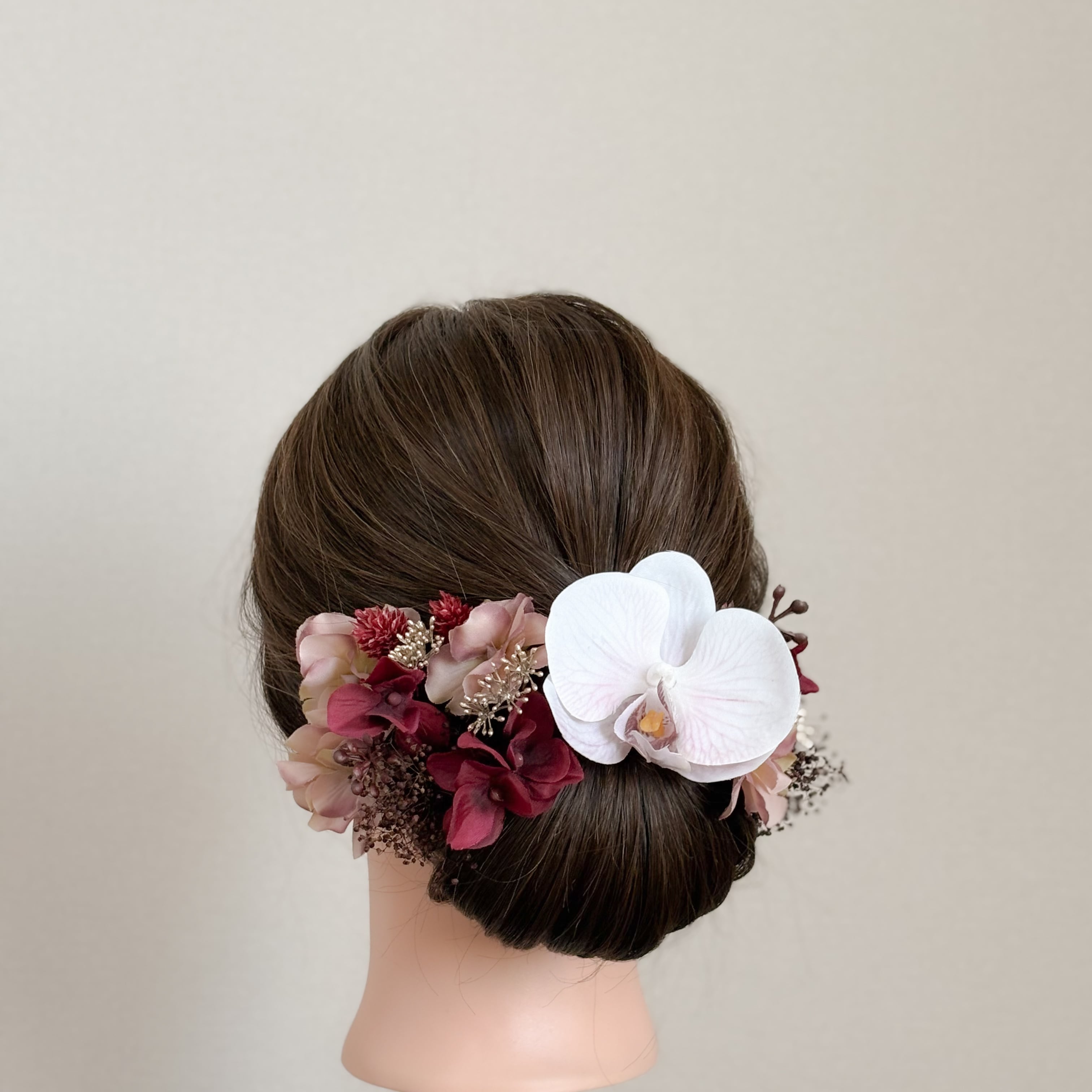ラベンダーカラーの花脈が美しい胡蝶蘭をメインに、ボルドーやモーブの上品なグラデーションでまとめた髪飾りセット。