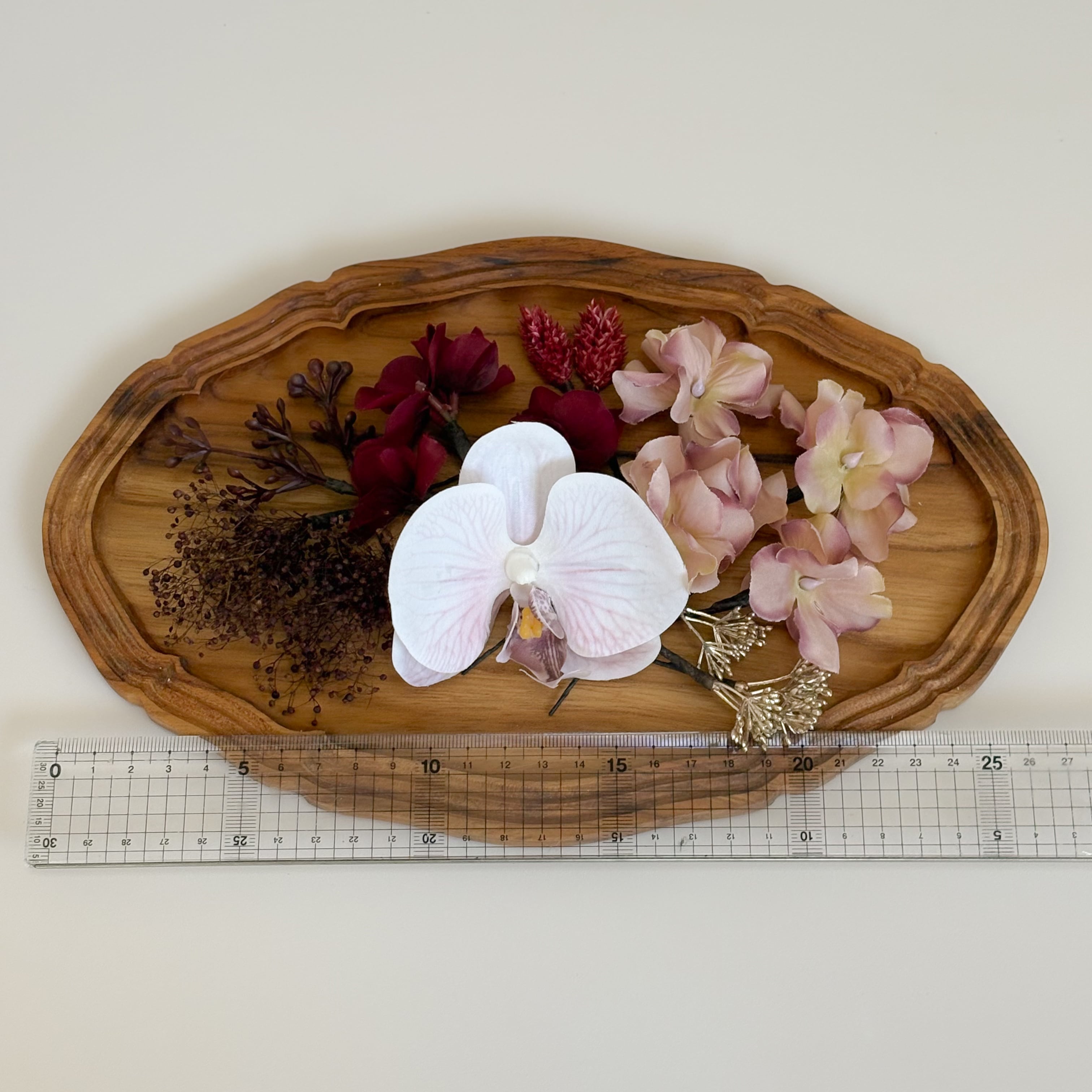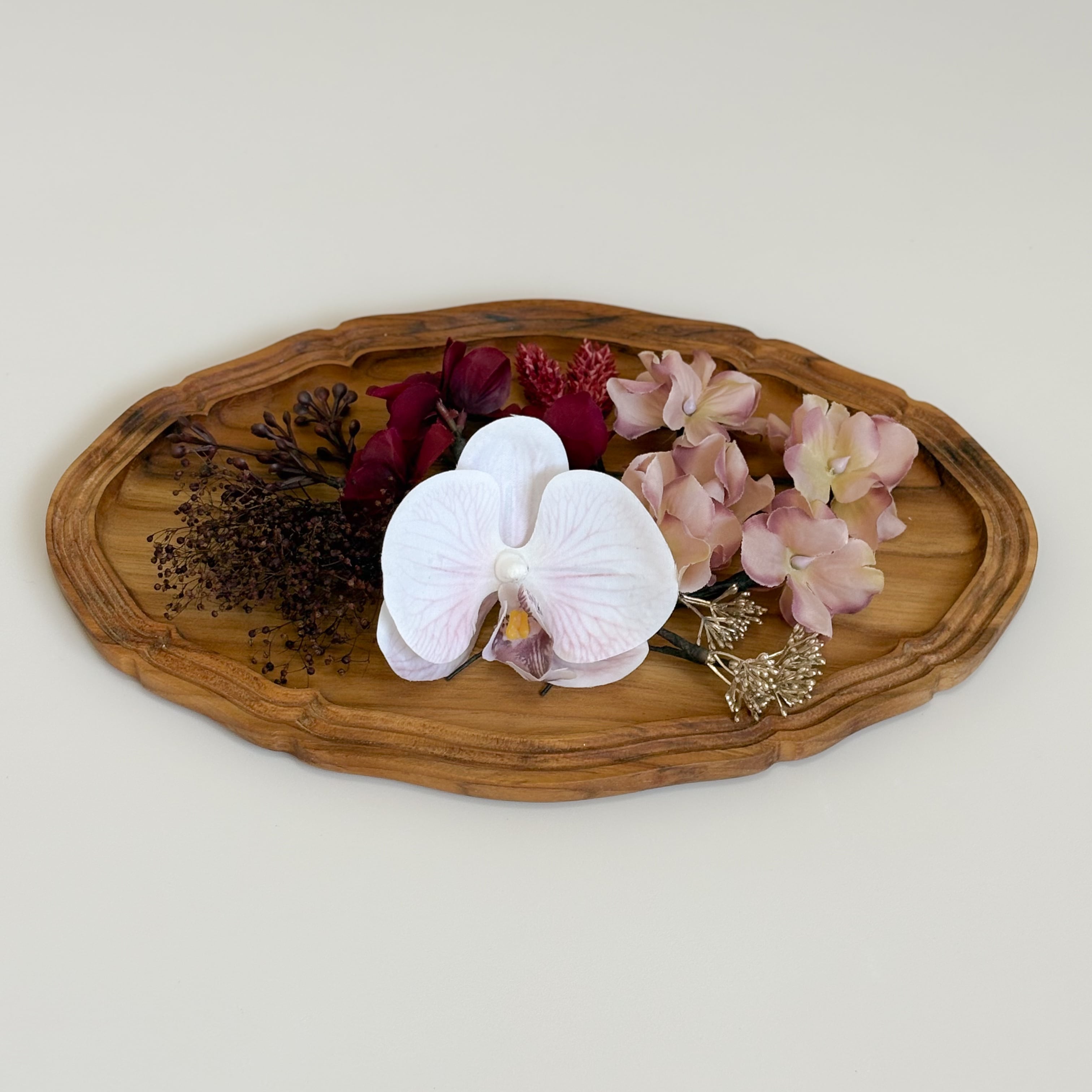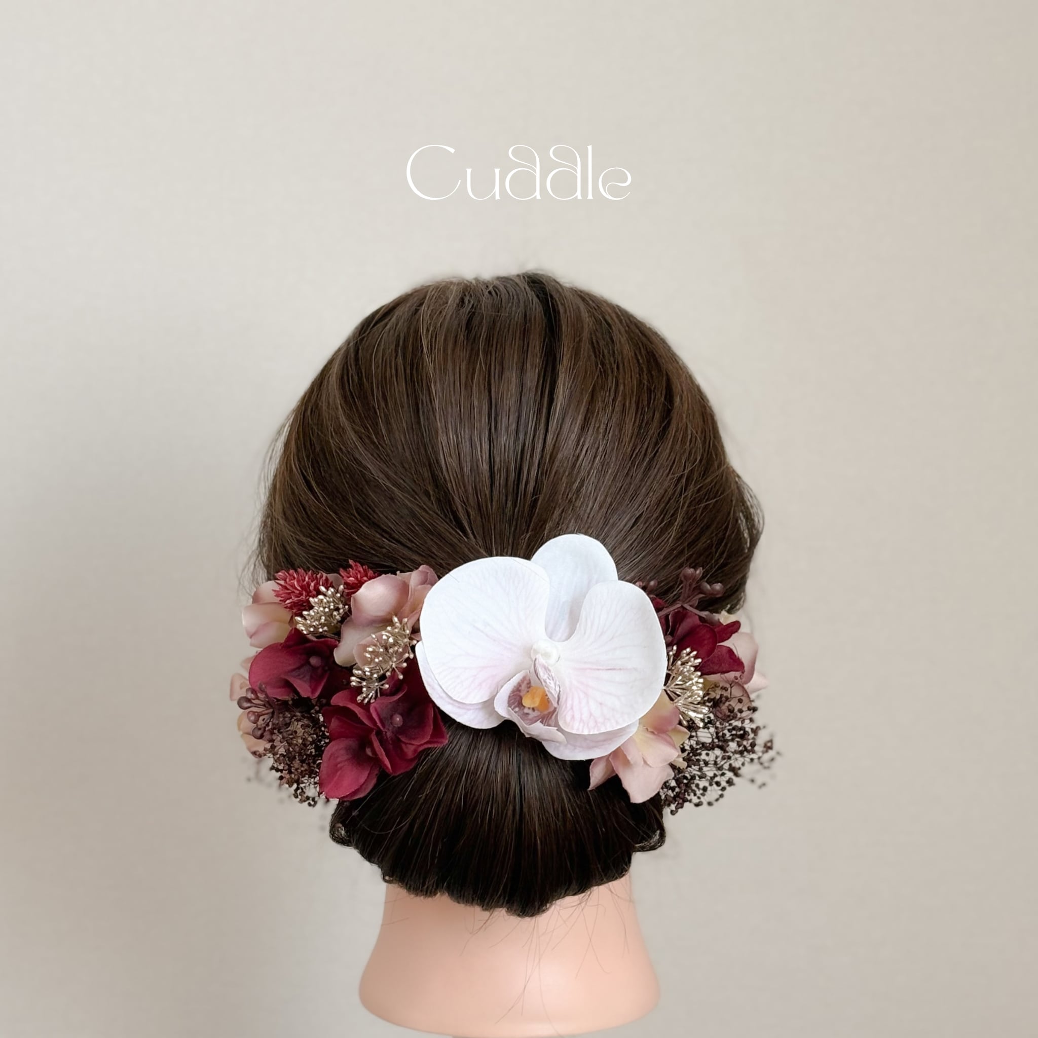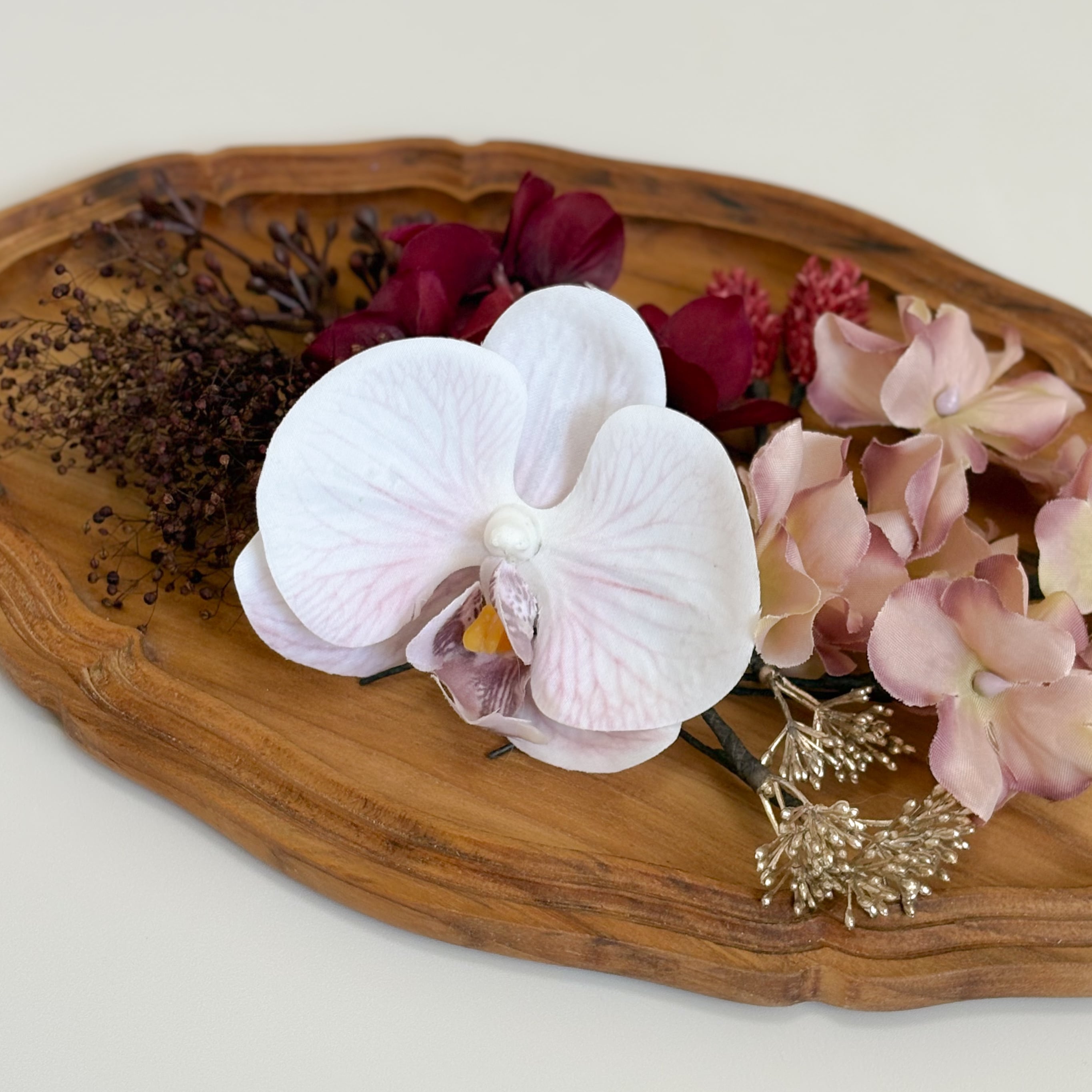 ラベンダーカラーの花脈が美しい胡蝶蘭をメインに、ボルドーやモーブの上品なグラデーションでまとめた髪飾りセット。