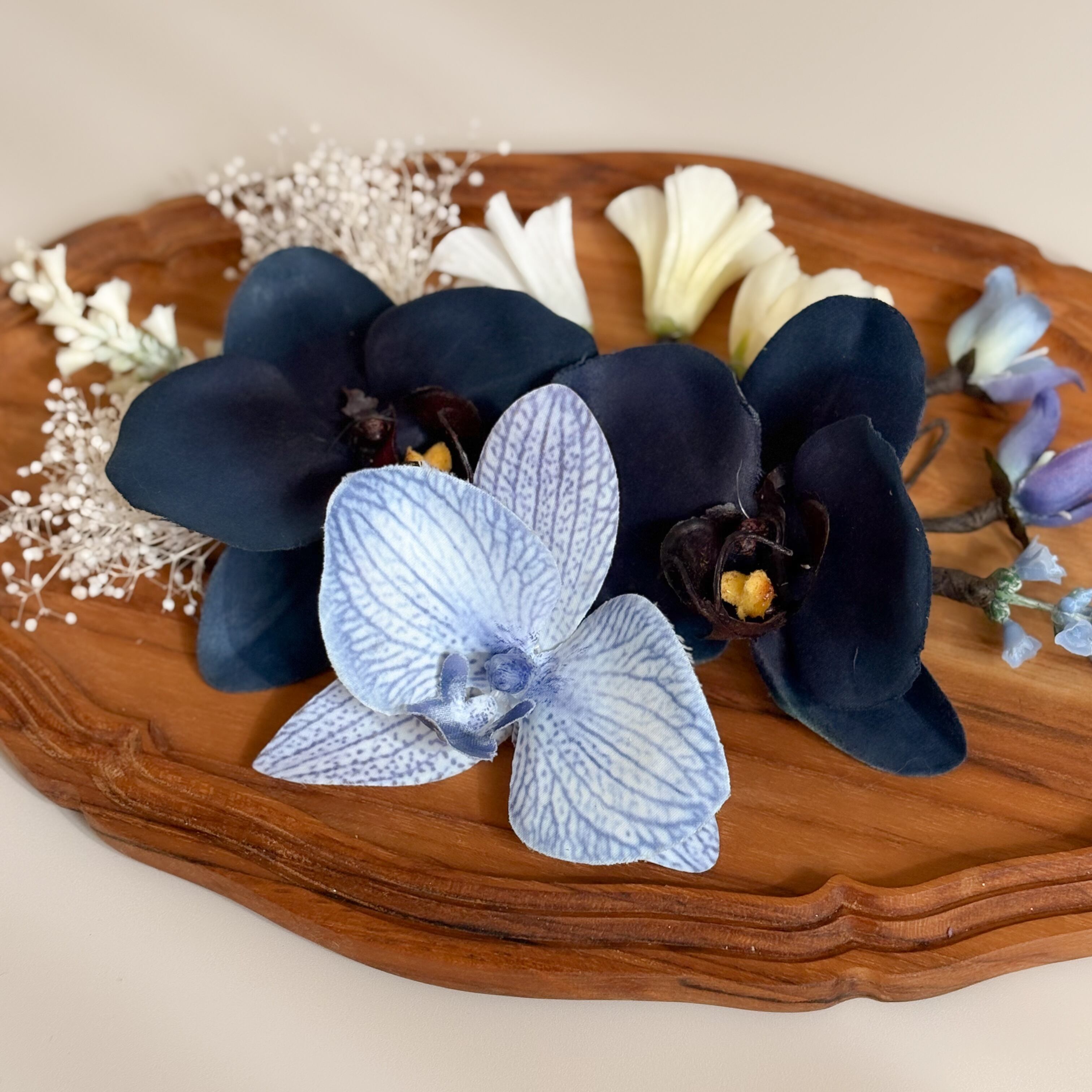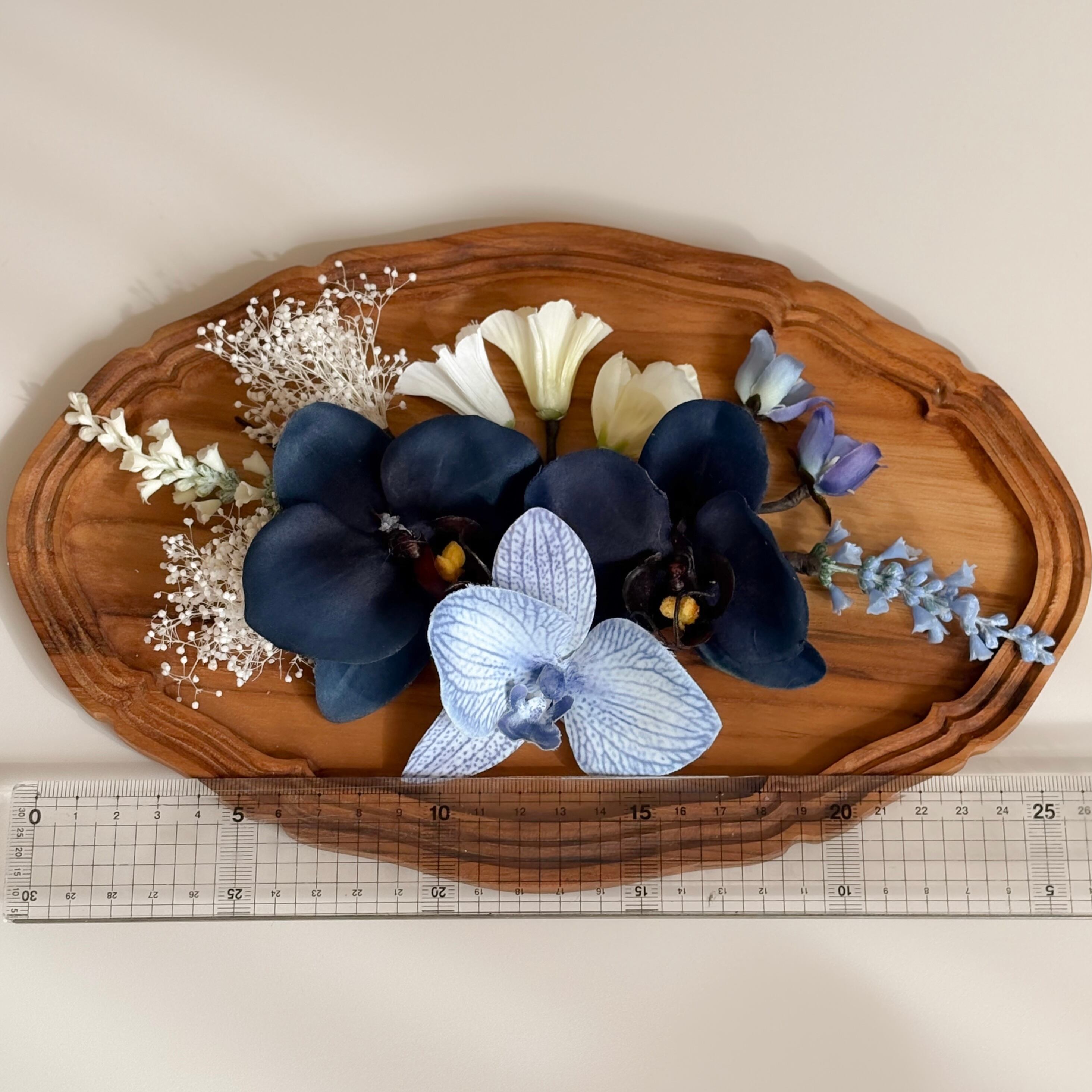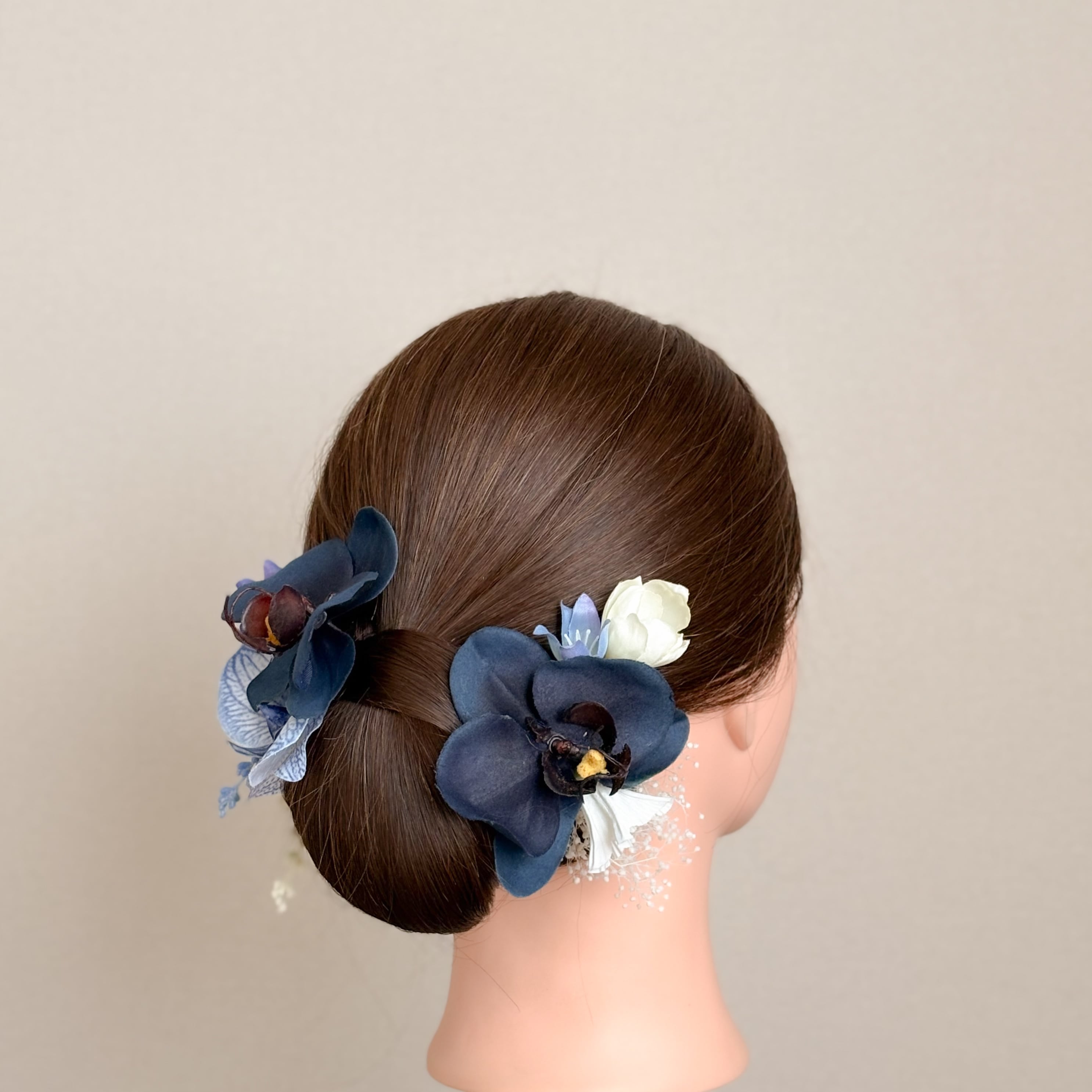 ホワイトブルーの胡蝶蘭がメインの髪飾りセット。
