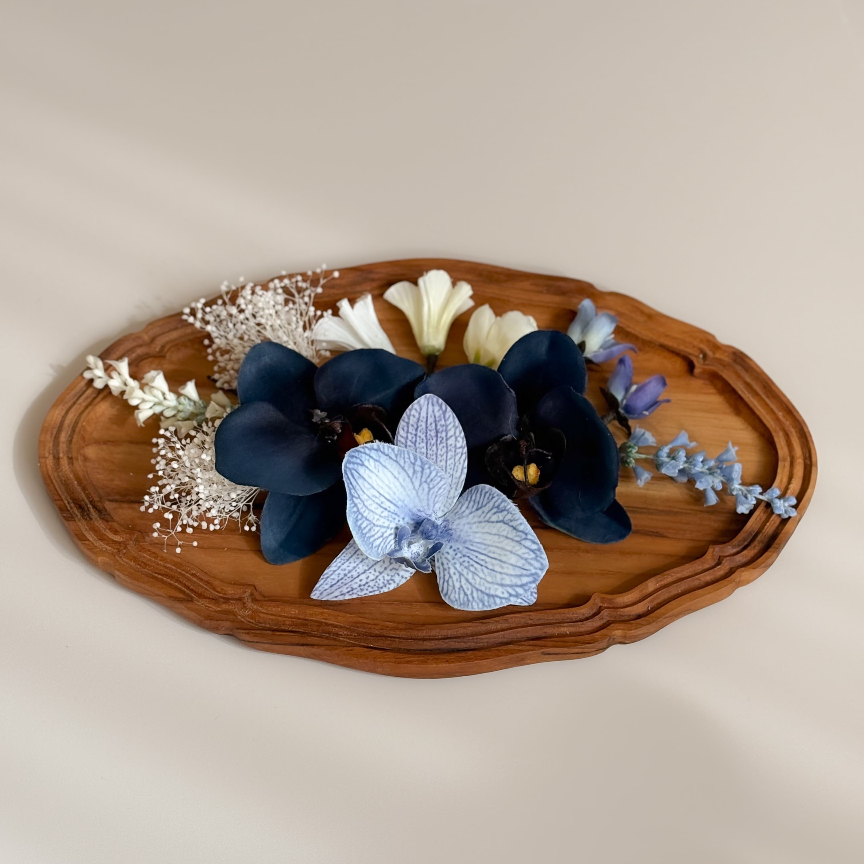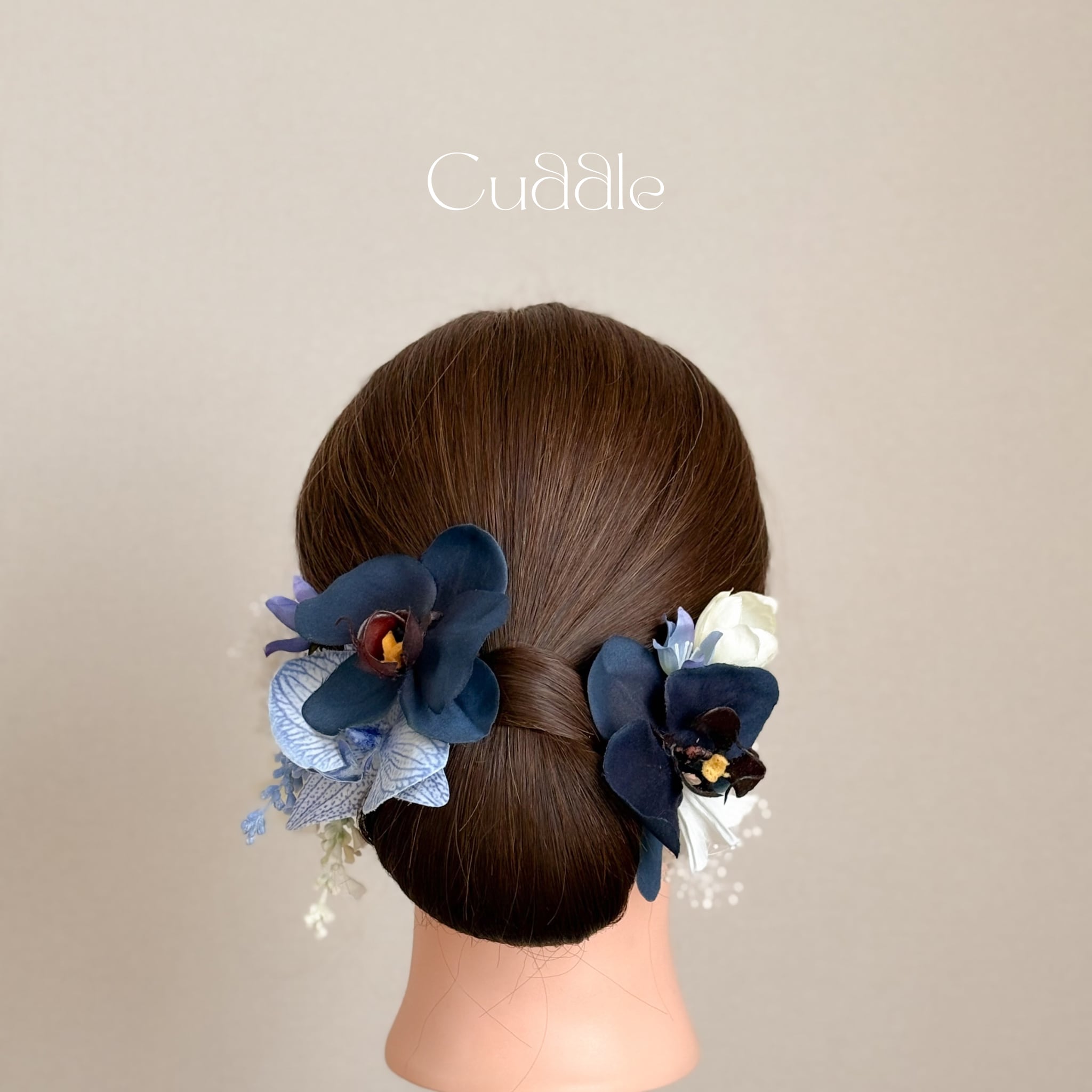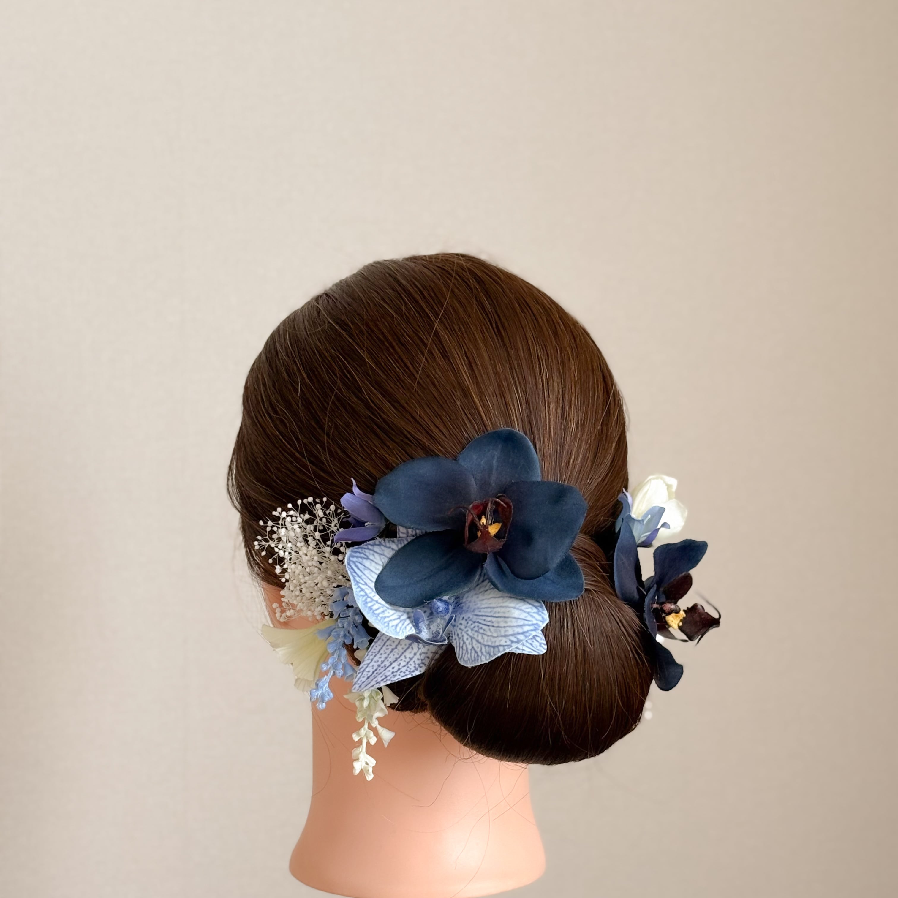 ホワイトブルーの胡蝶蘭がメインの髪飾りセット。