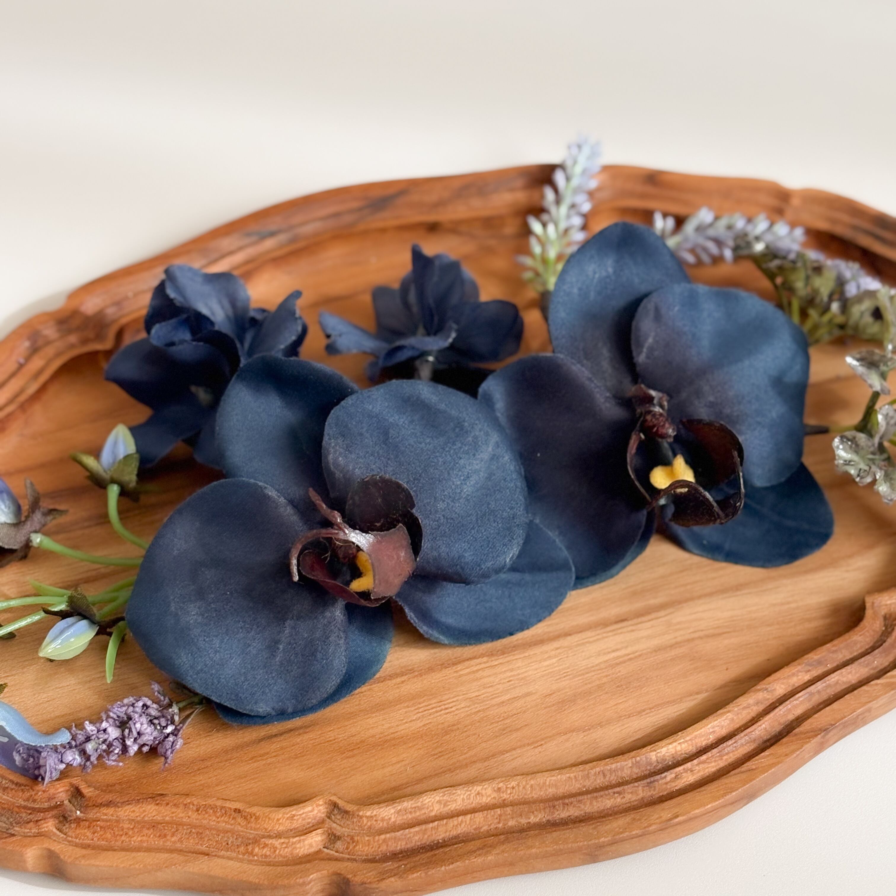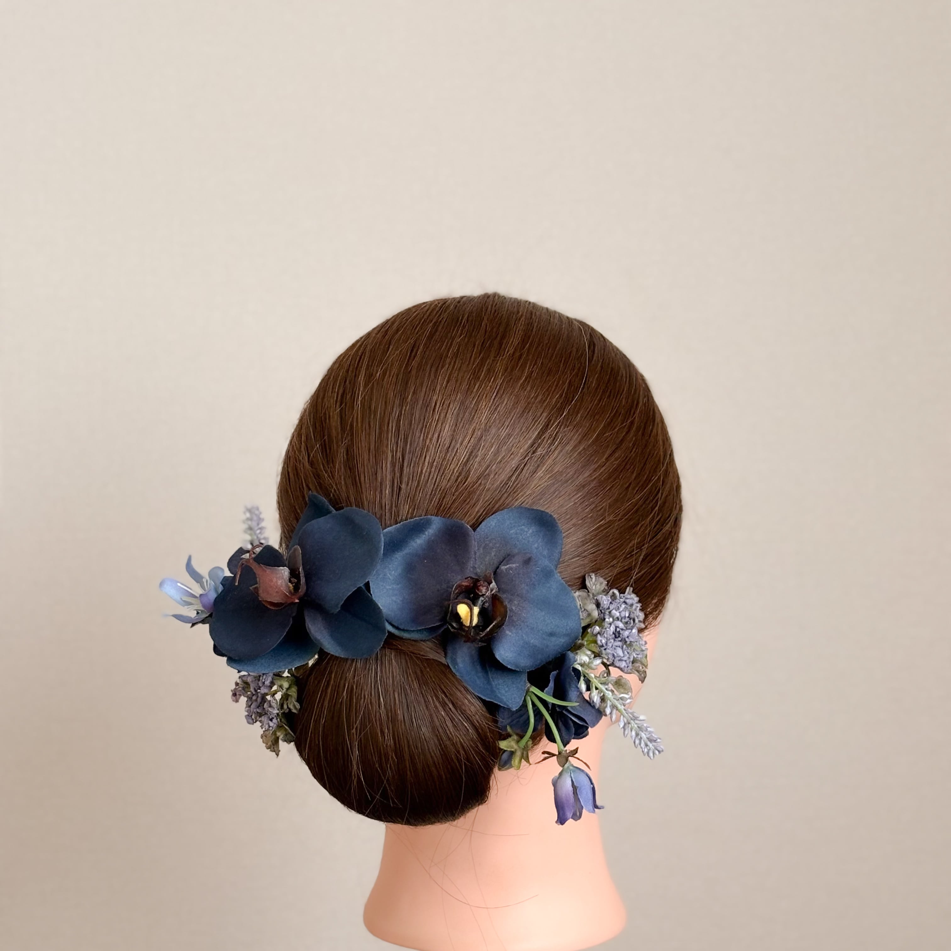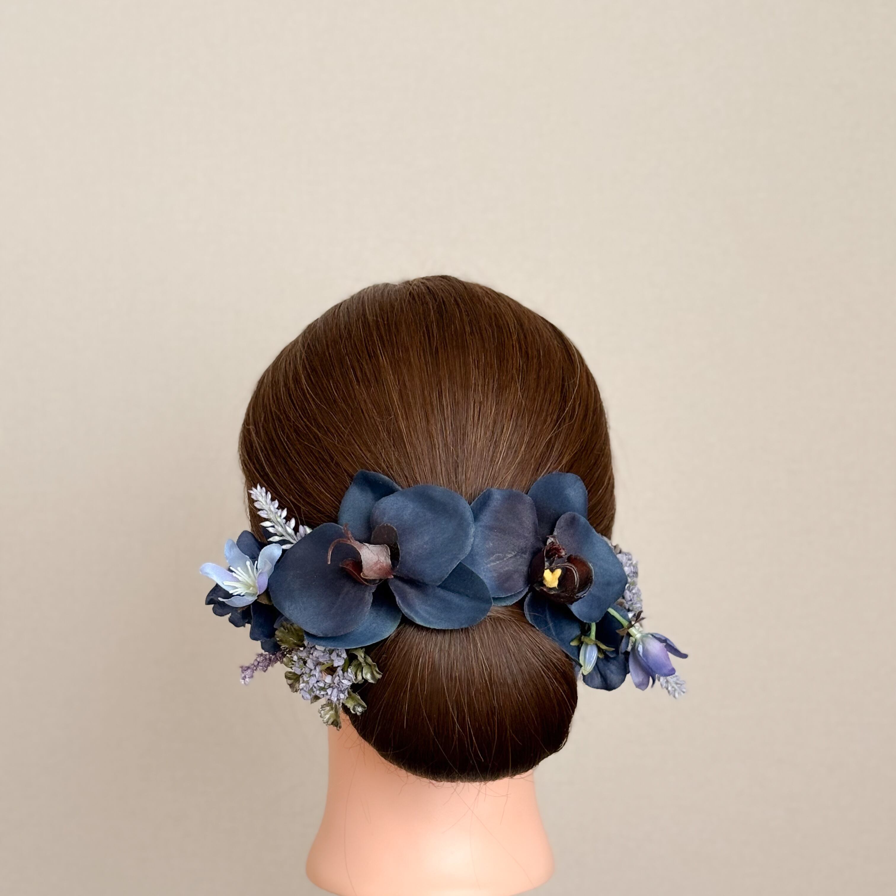 ディープネイビーの胡蝶蘭2輪がメインの髪飾りセット。