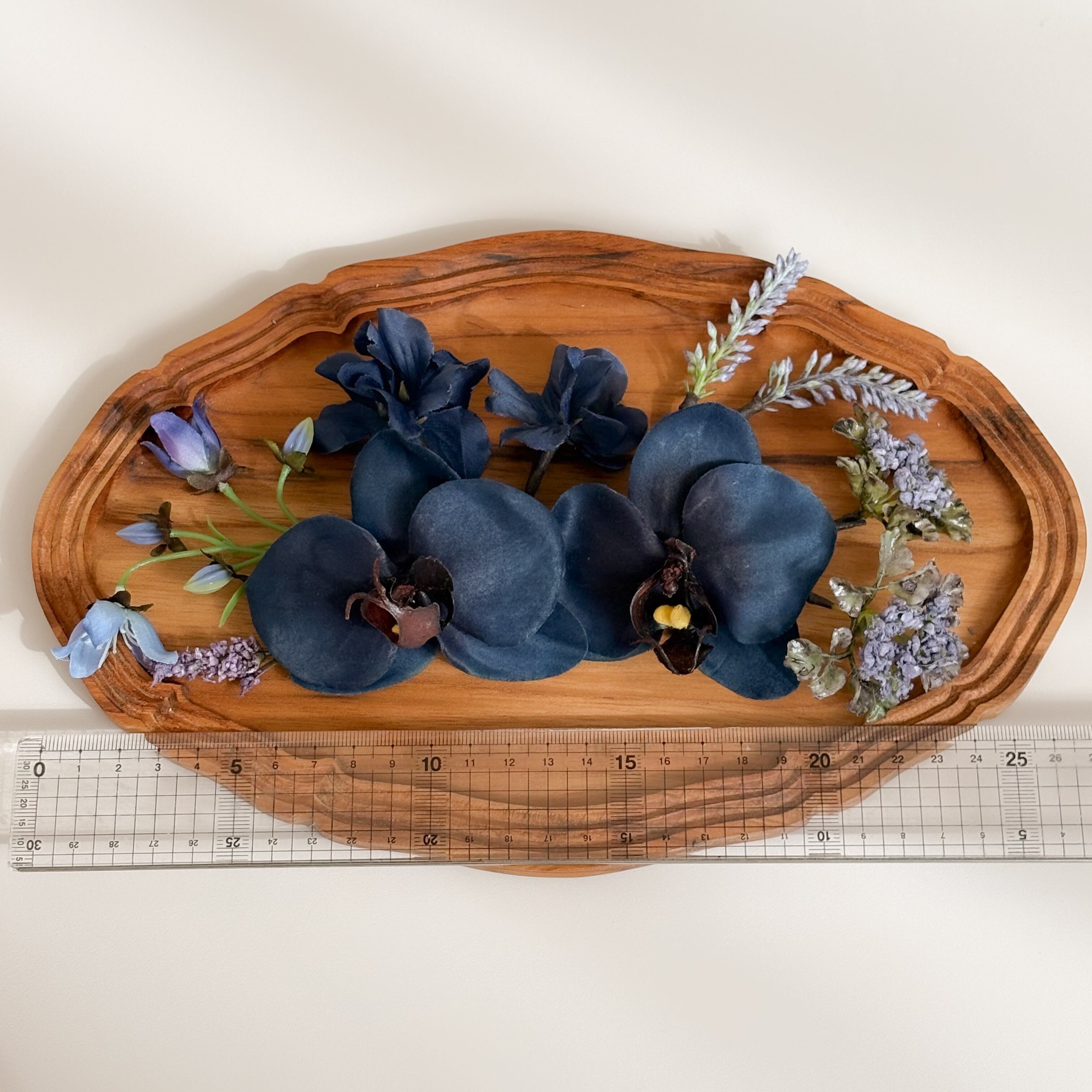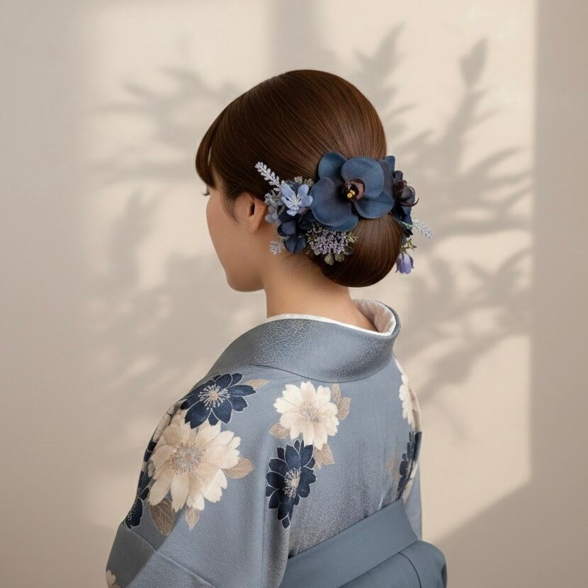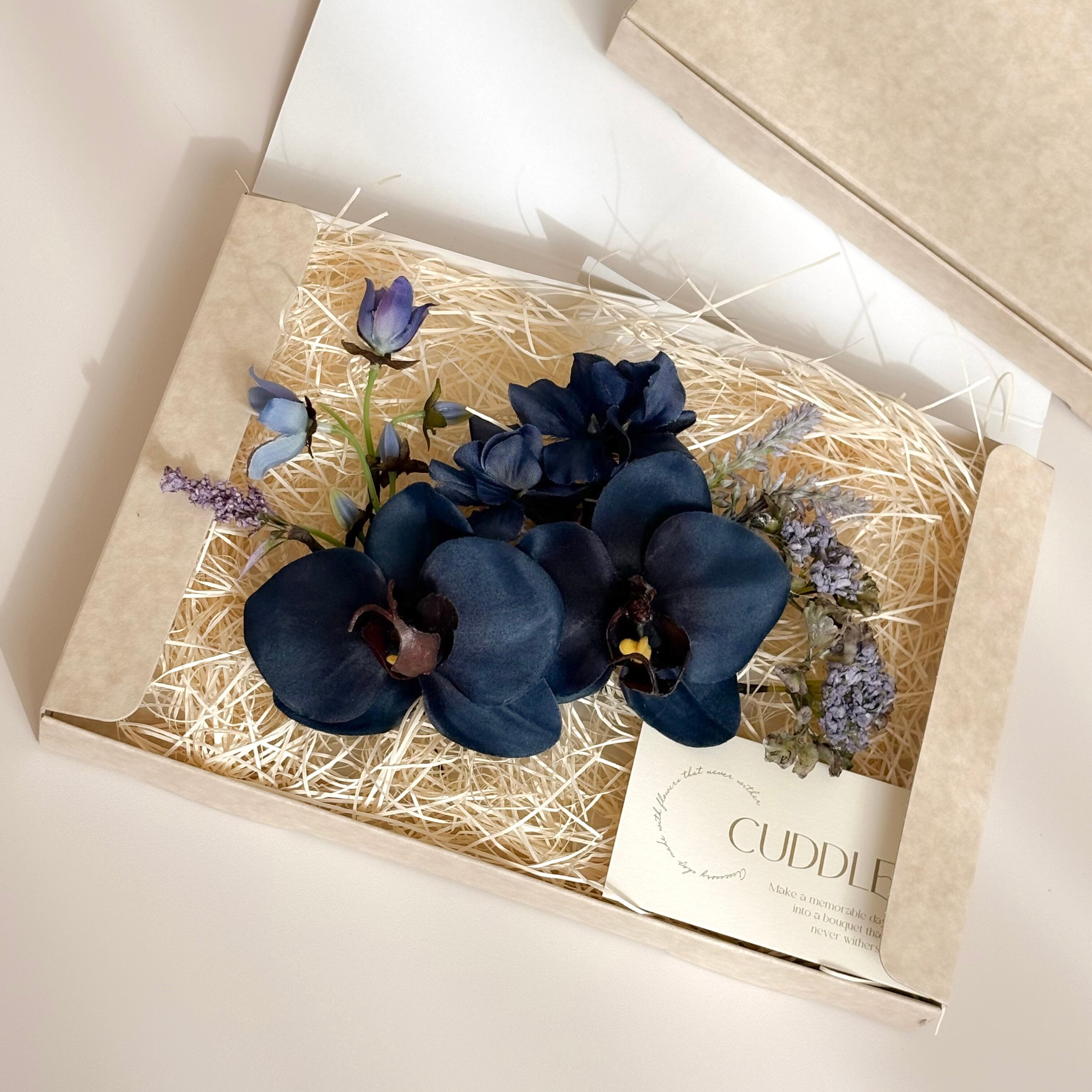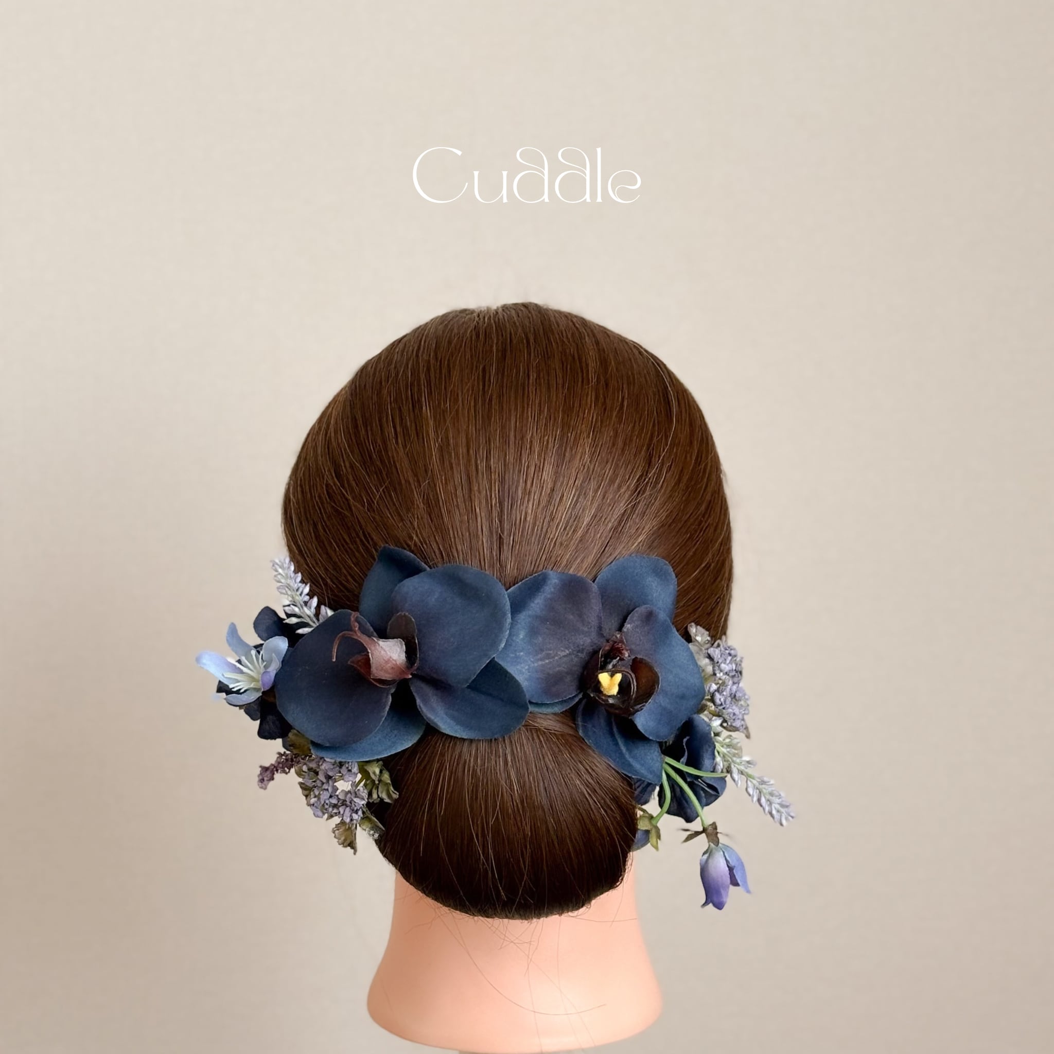 ディープネイビーの胡蝶蘭2輪がメインの髪飾りセット。