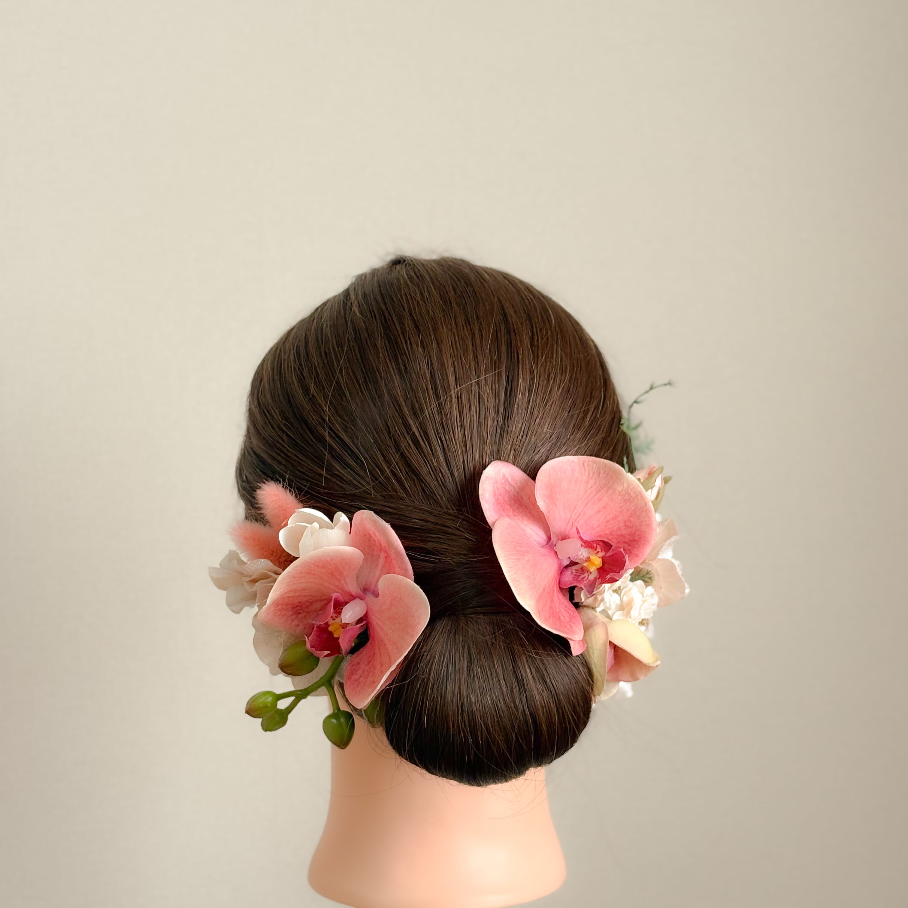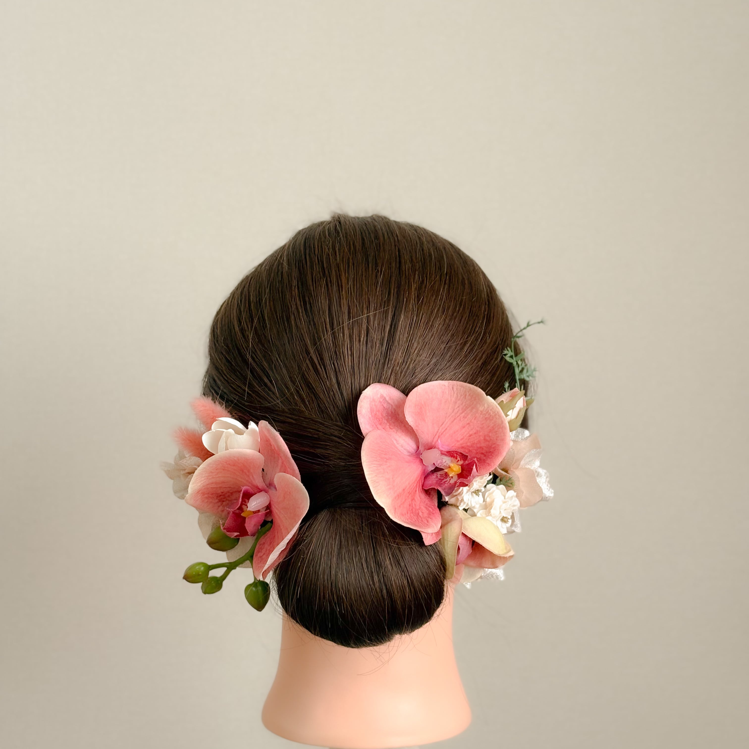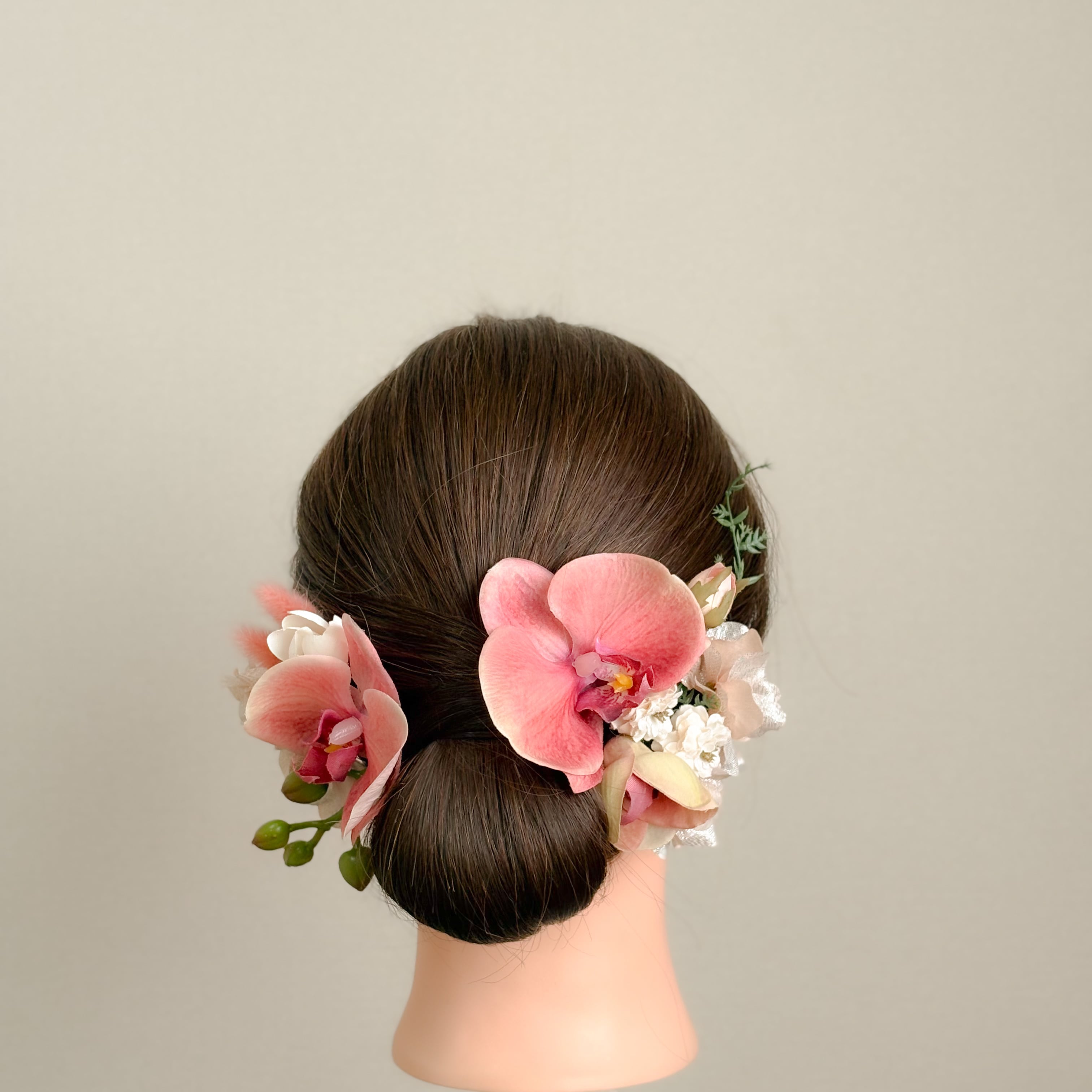 グラデーションが印象的なピーチバーガンディの胡蝶蘭をメインとした髪飾り。