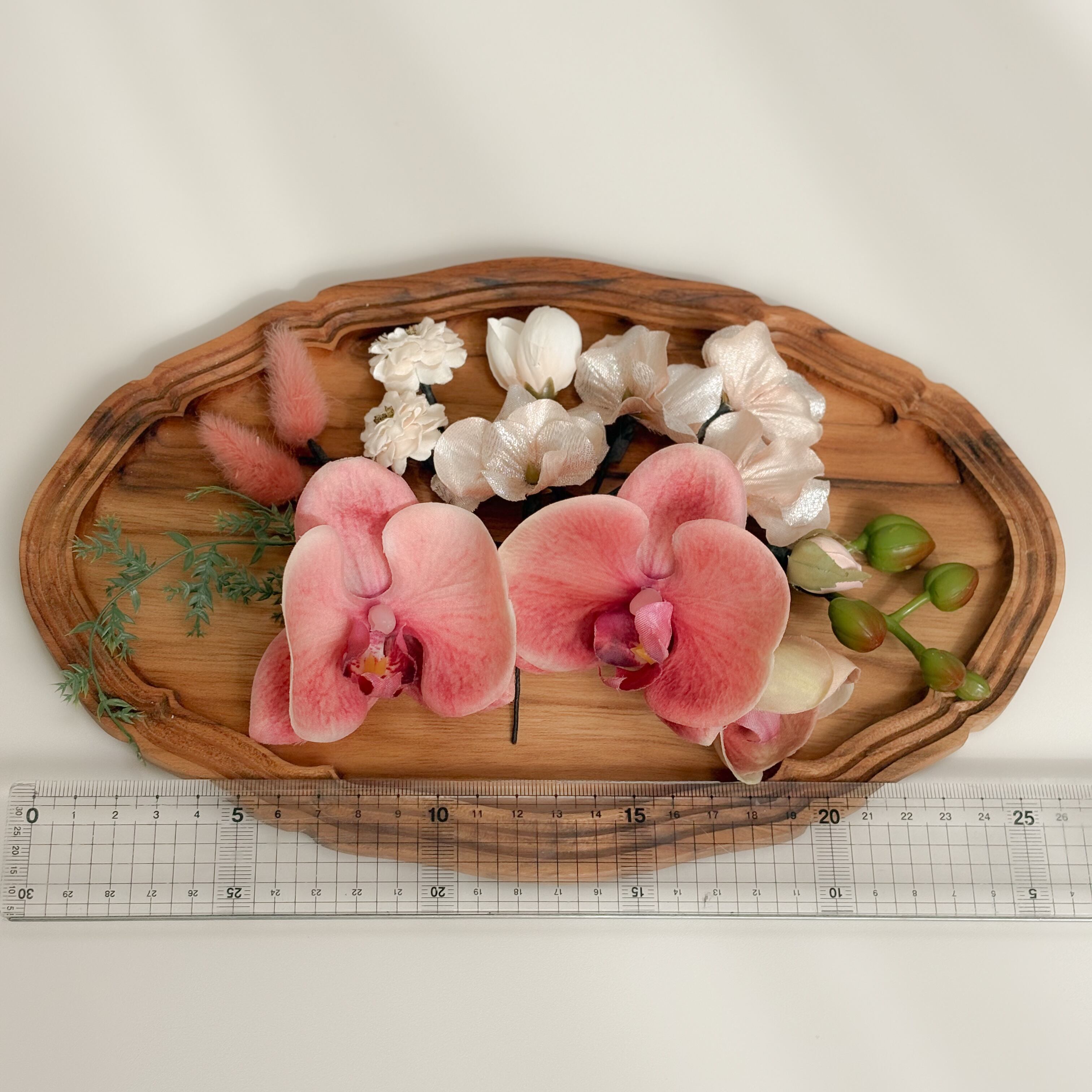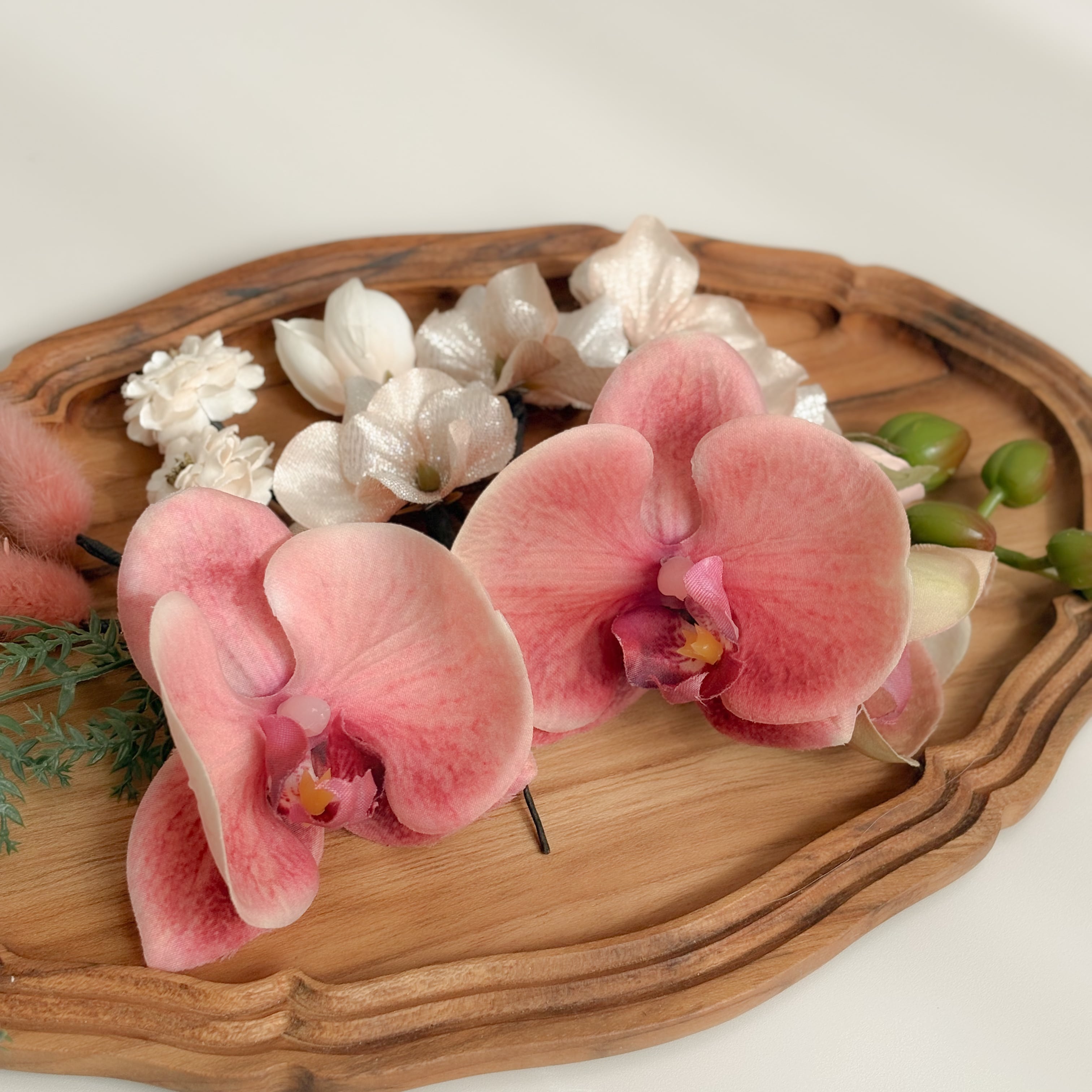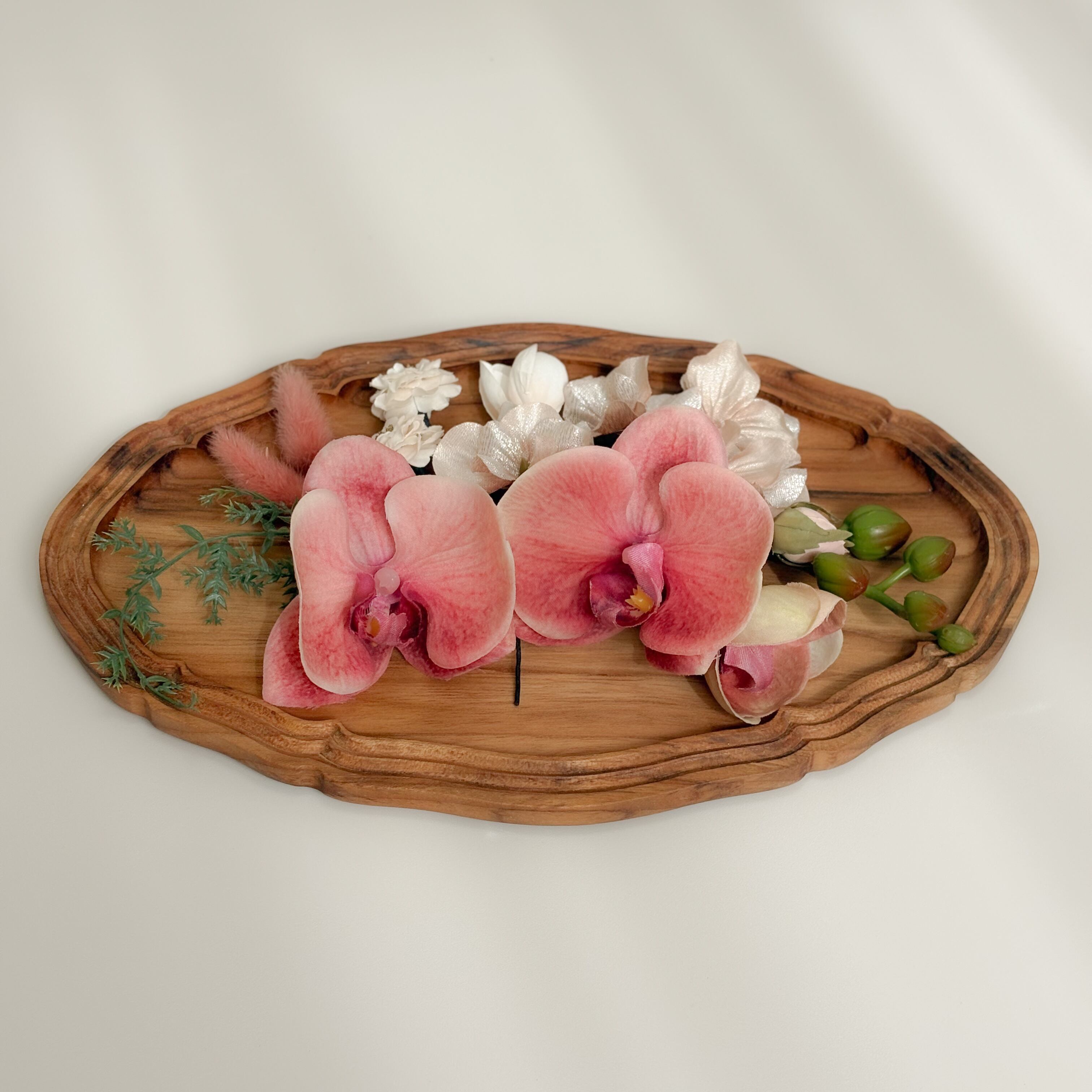 グラデーションが印象的なピーチバーガンディの胡蝶蘭をメインとした髪飾り。