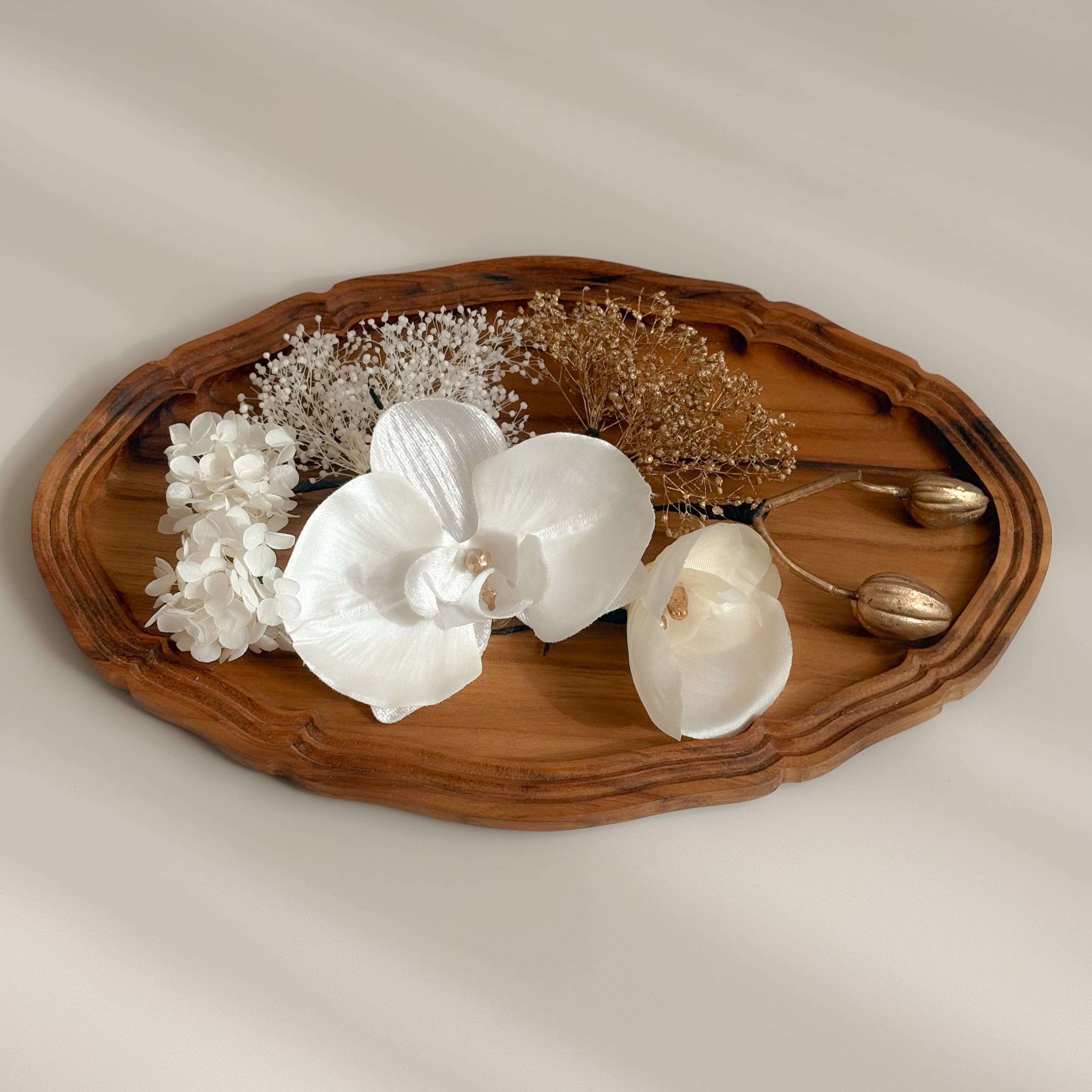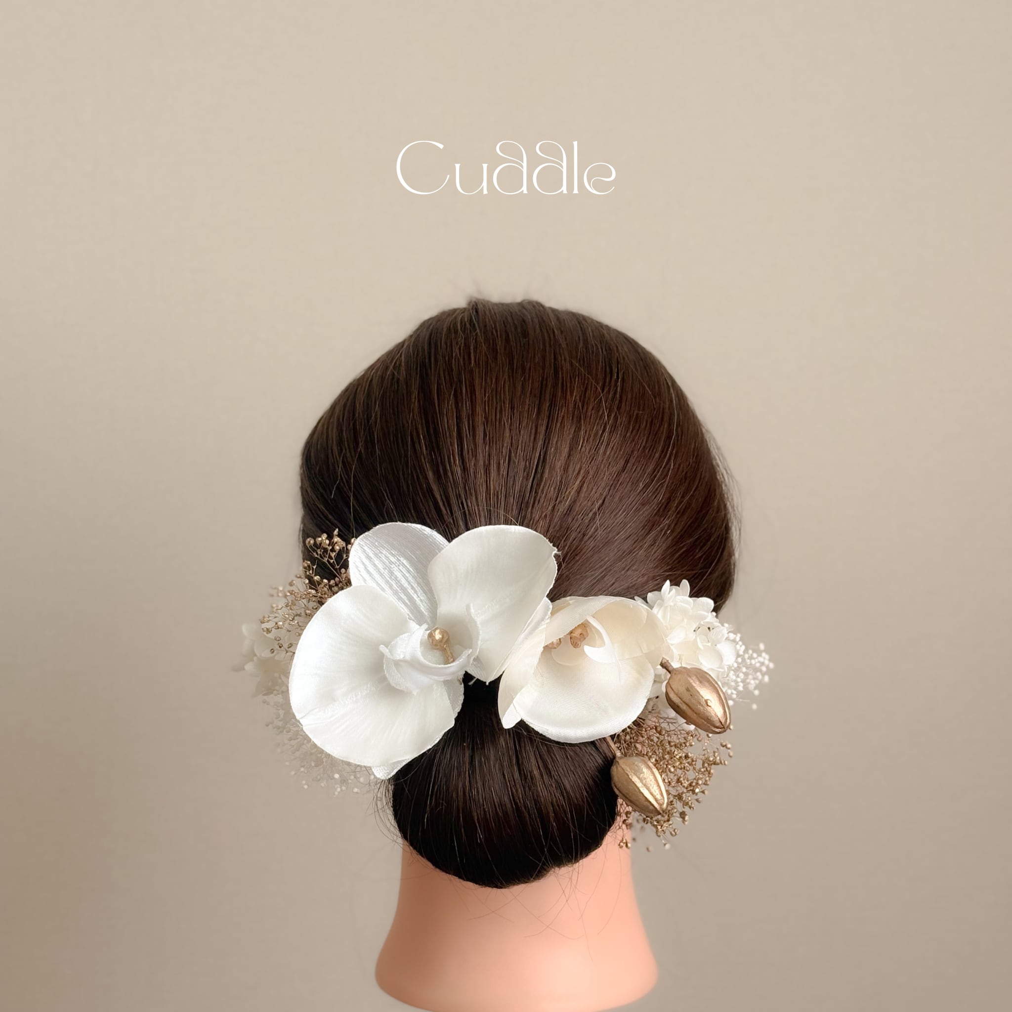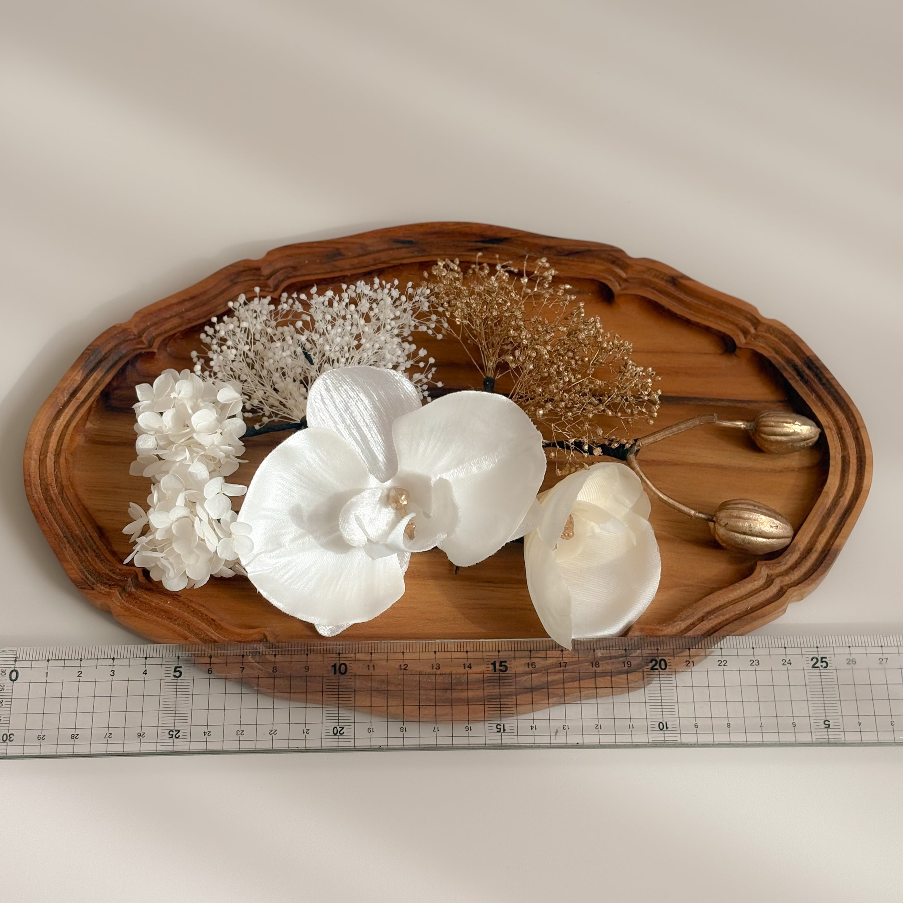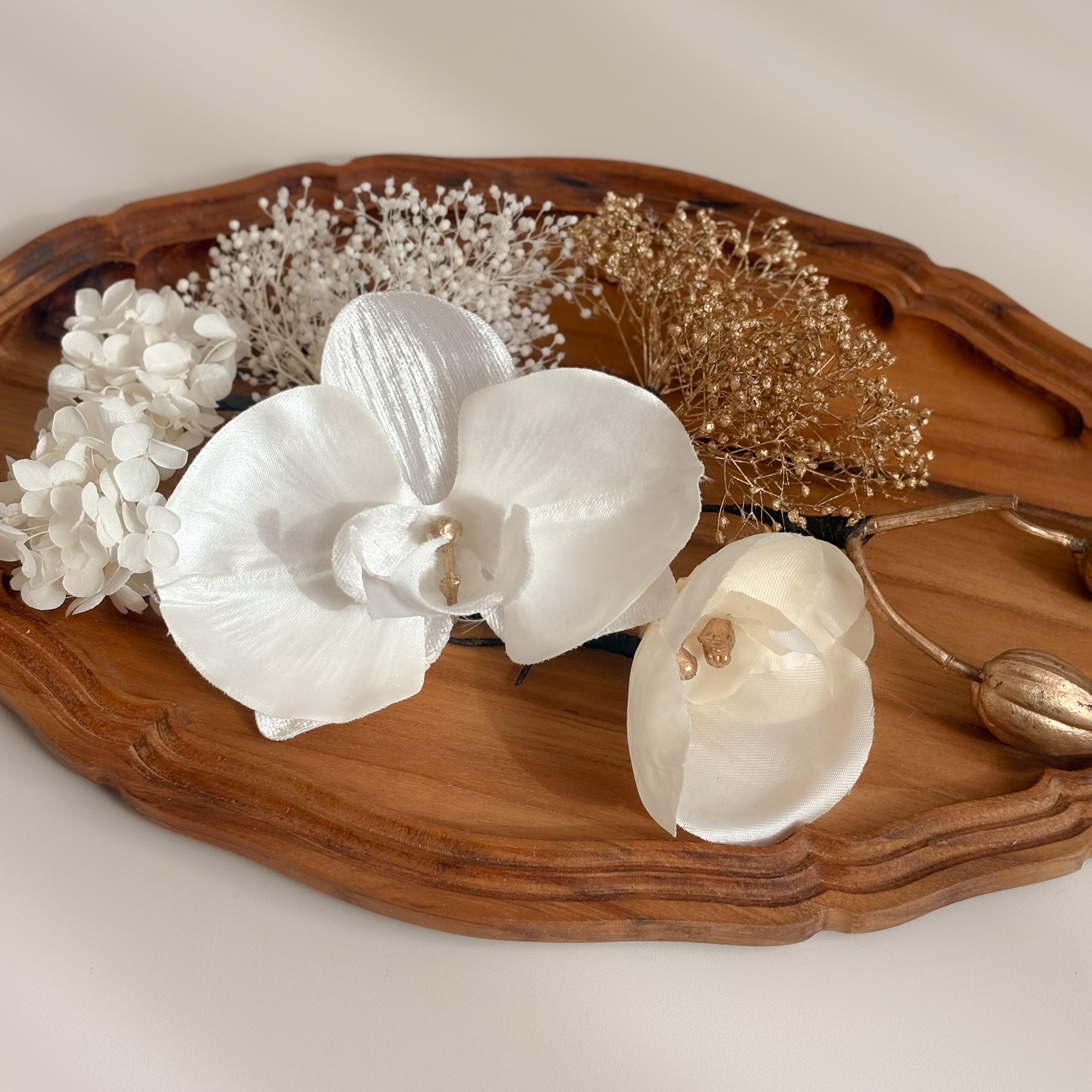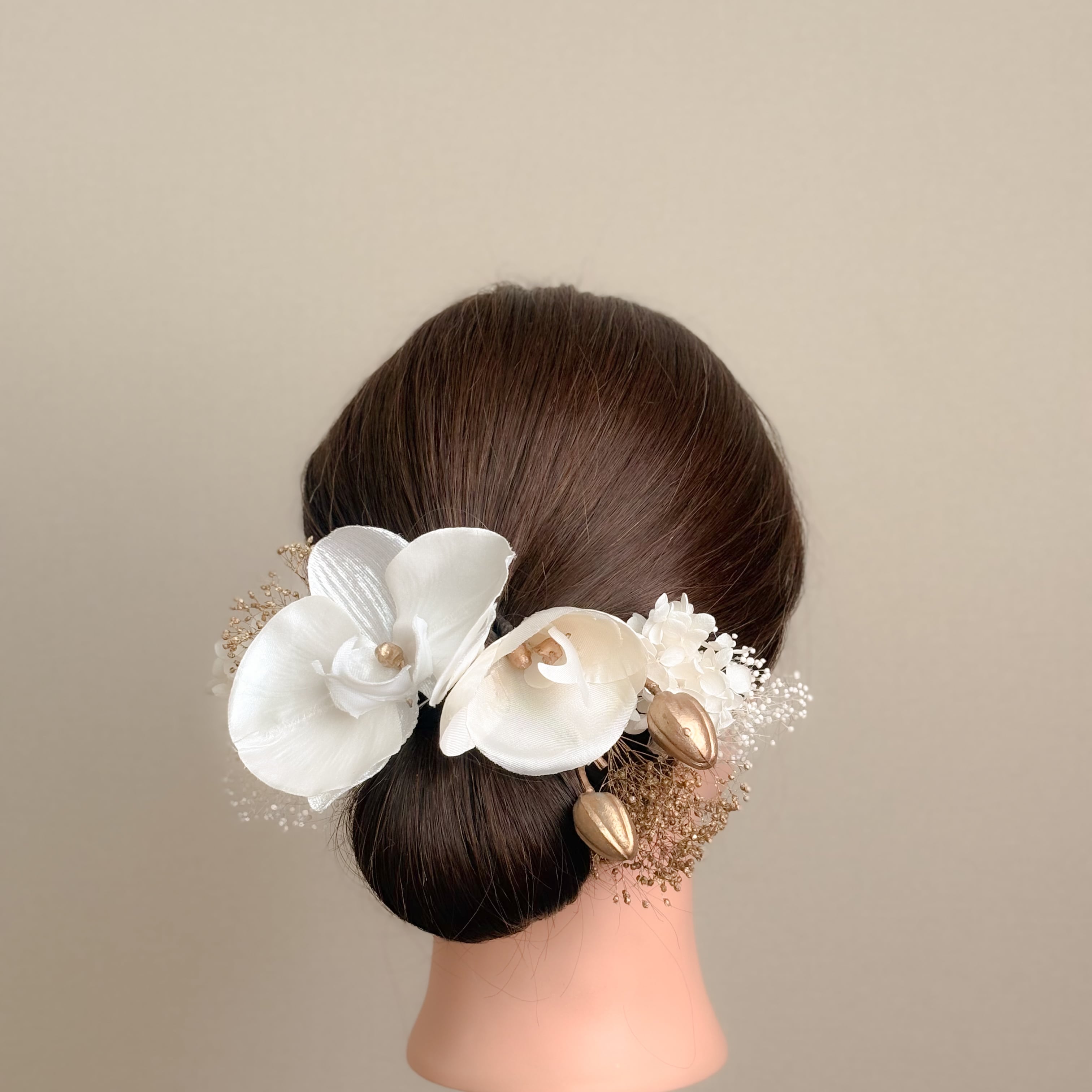 ホワイトとゴールドで品よくまとめた胡蝶蘭の髪飾り。