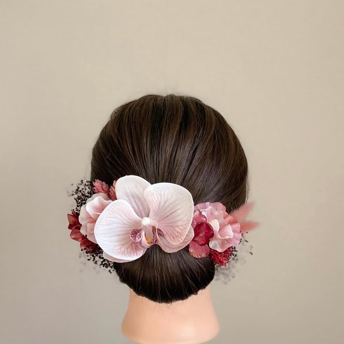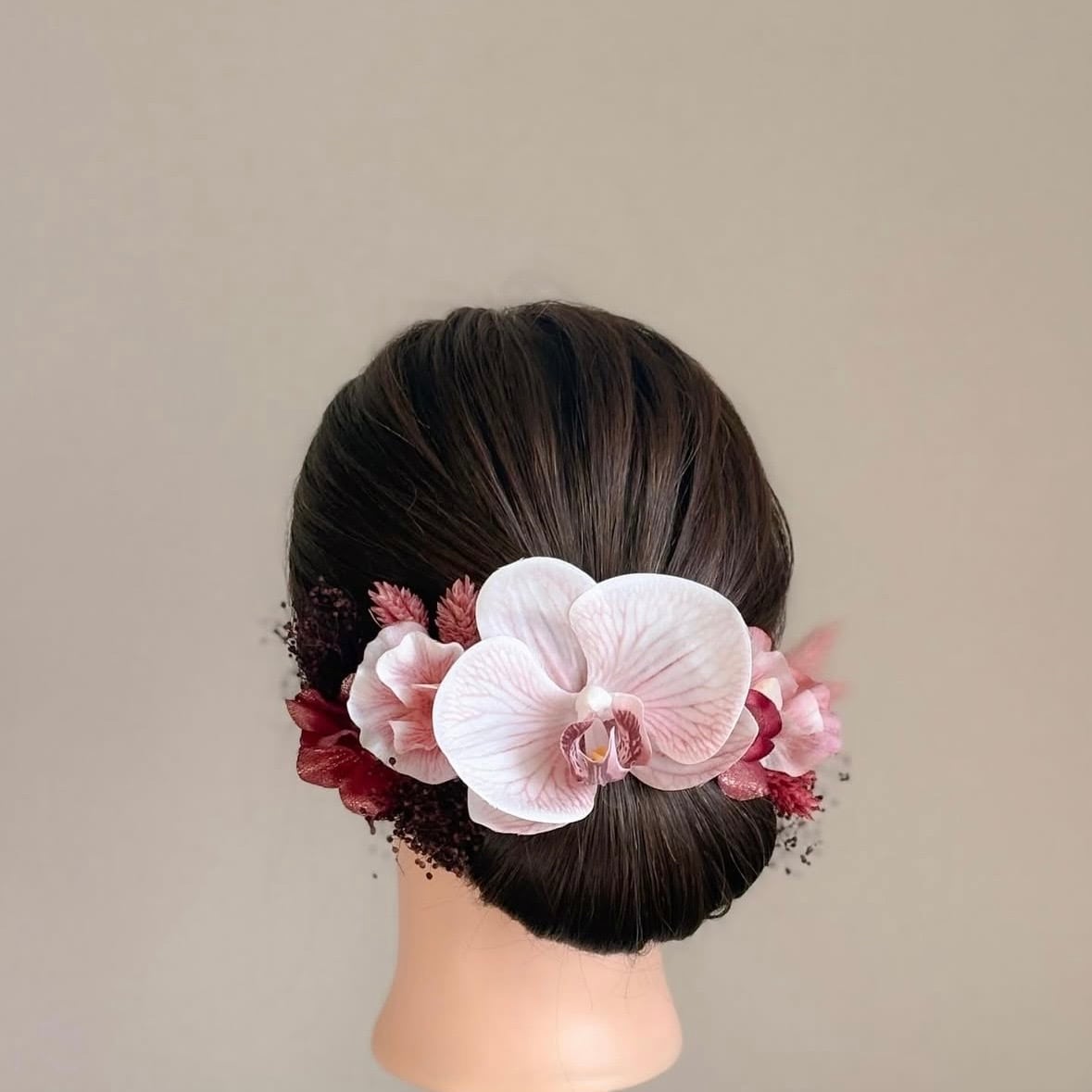 ホワイトにモーブカラーの花脈が美しい、凛とした胡蝶蘭をメインとした髪飾りセットです。