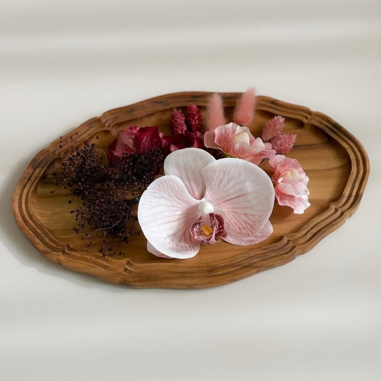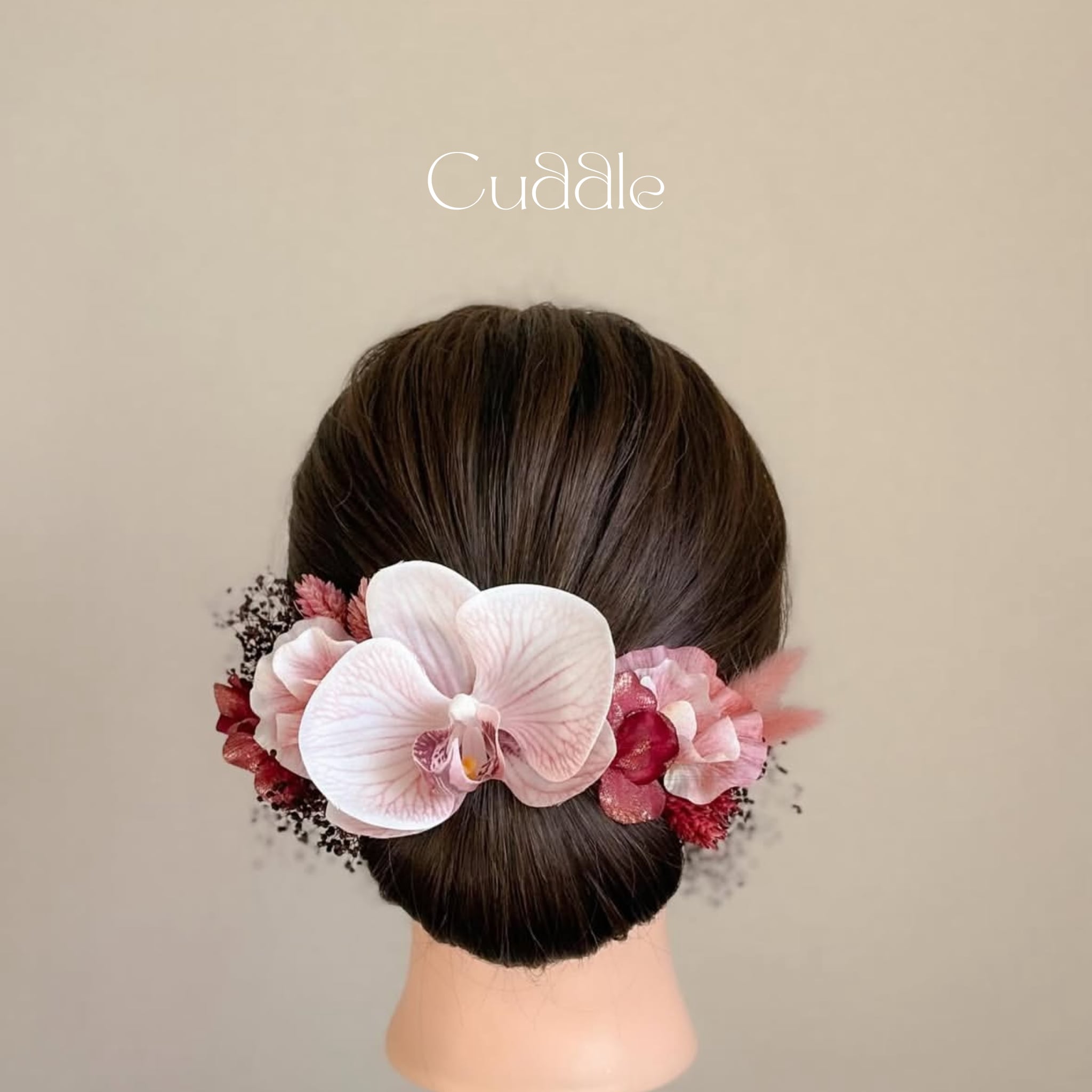 枯れることがないため色持ちがよく、持ち運びやすいことはもちろん、cuddleでは質感や色味のリアリティも備えた高品質のお花だけを使用し、使い勝手の良さだけに留まらない、お花の美しさが映えるような髪飾りに仕上げております。