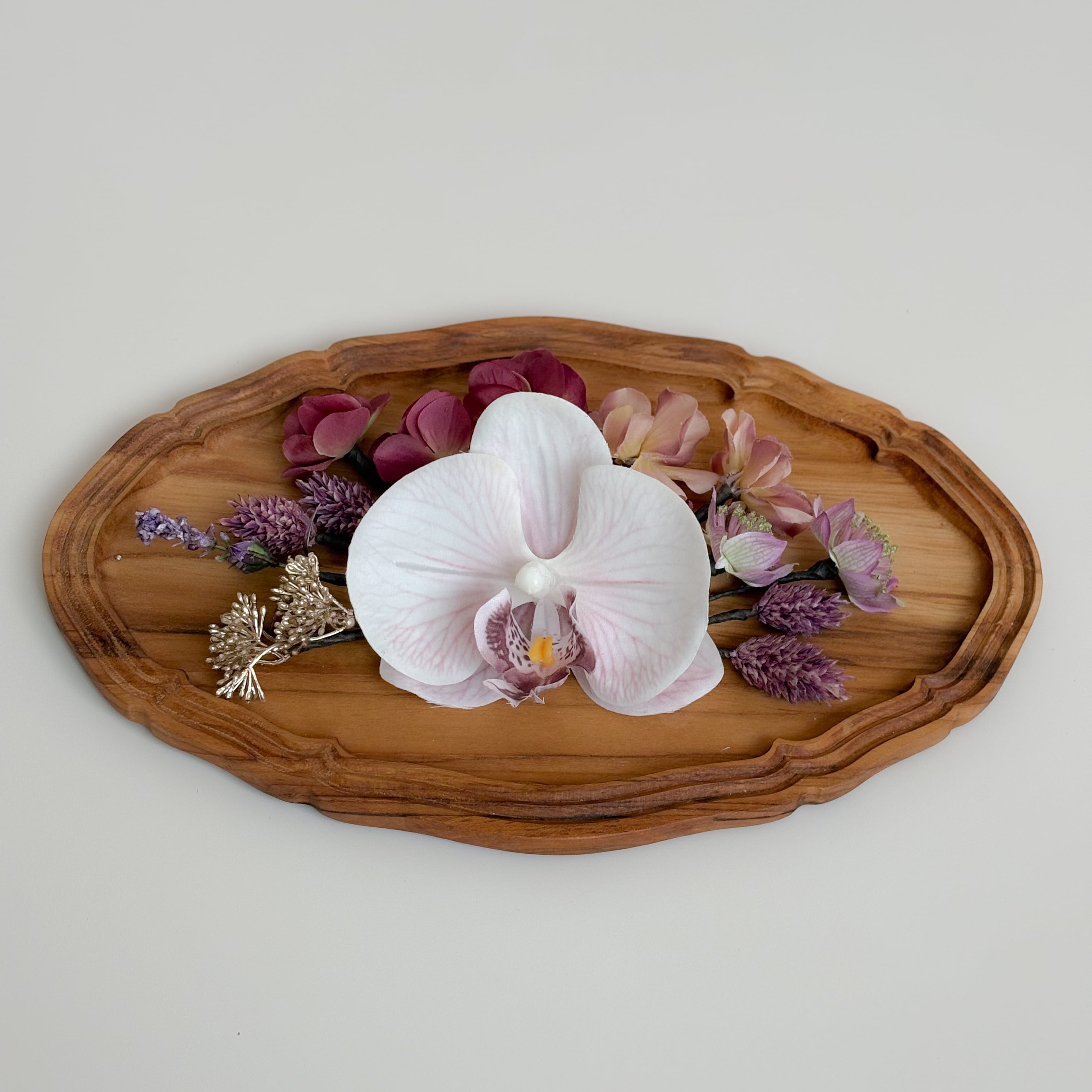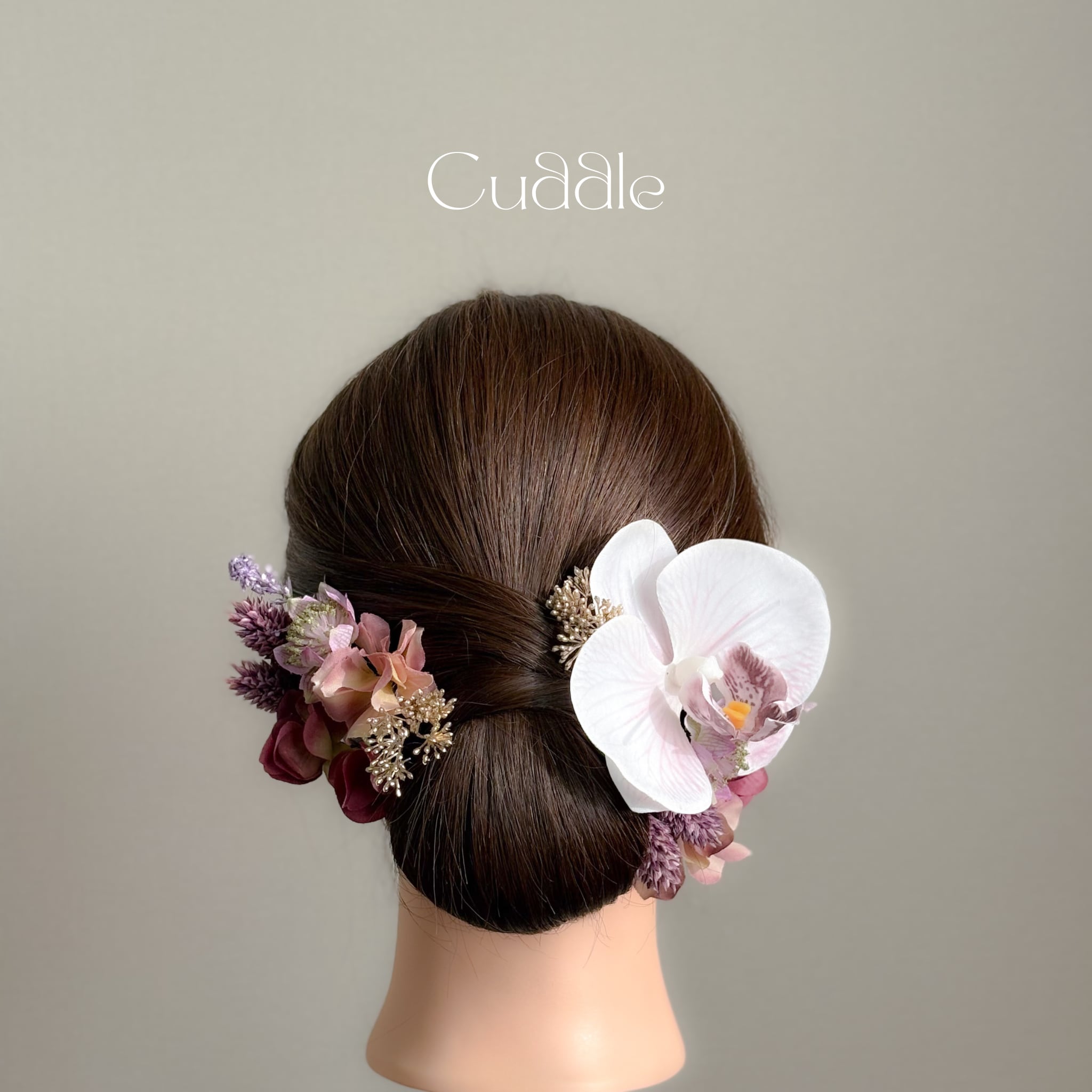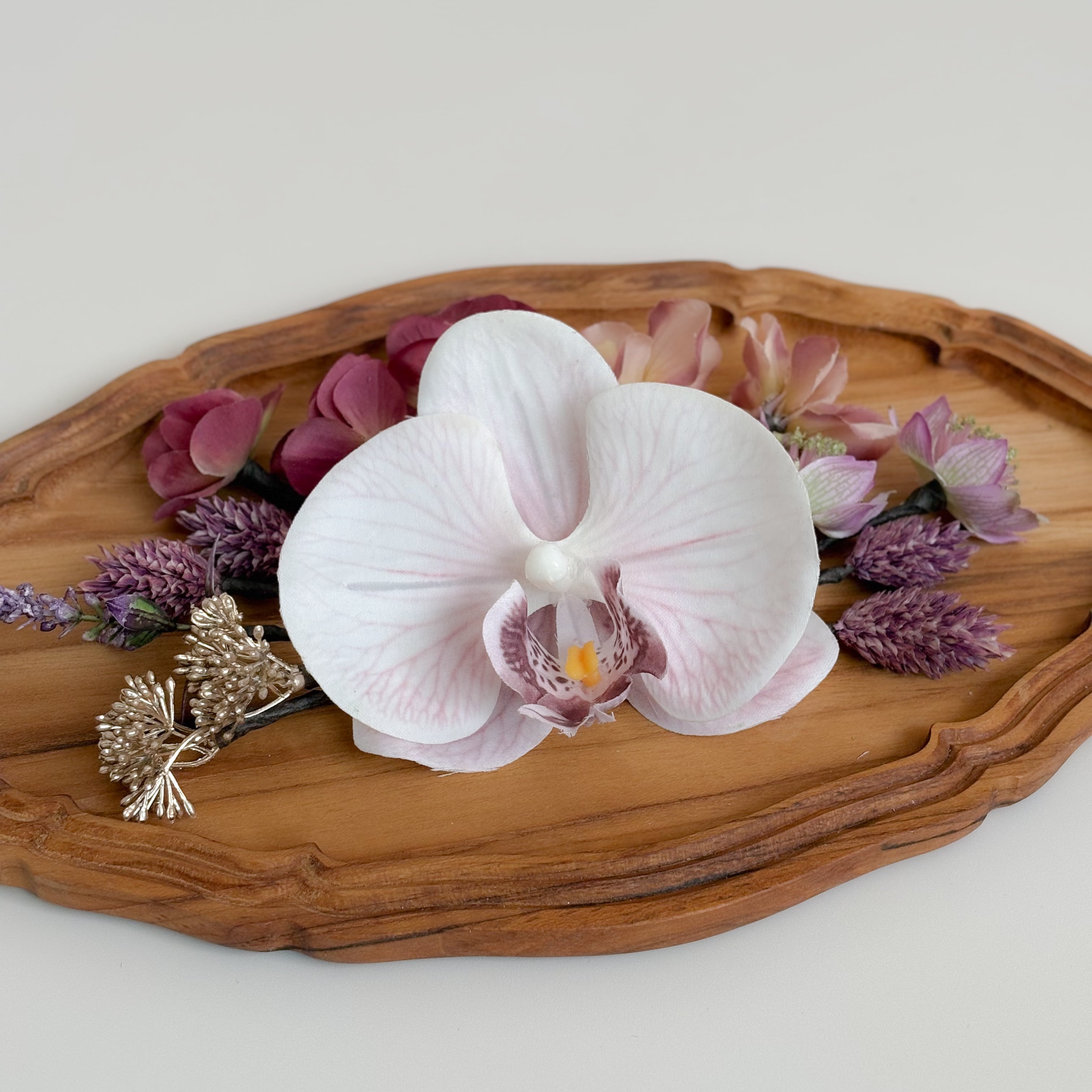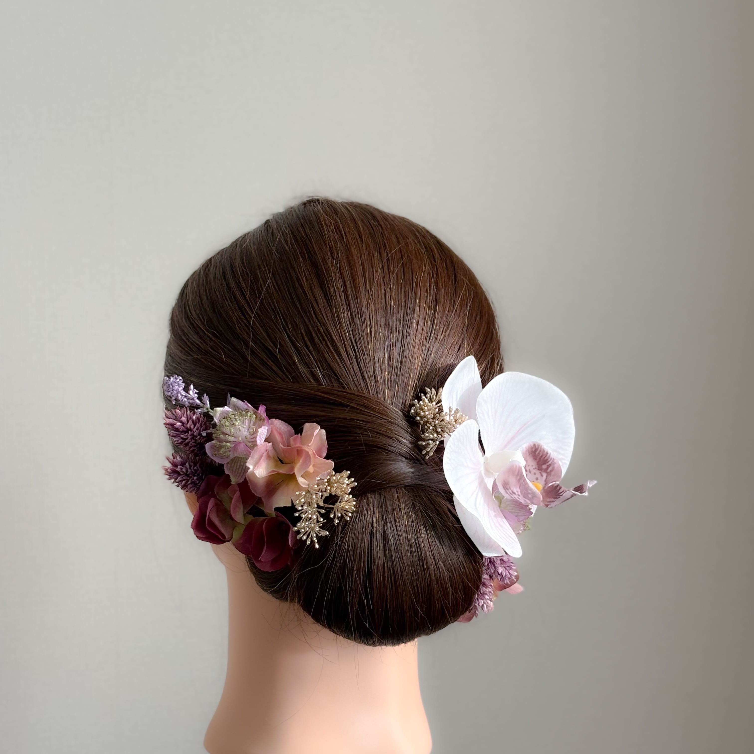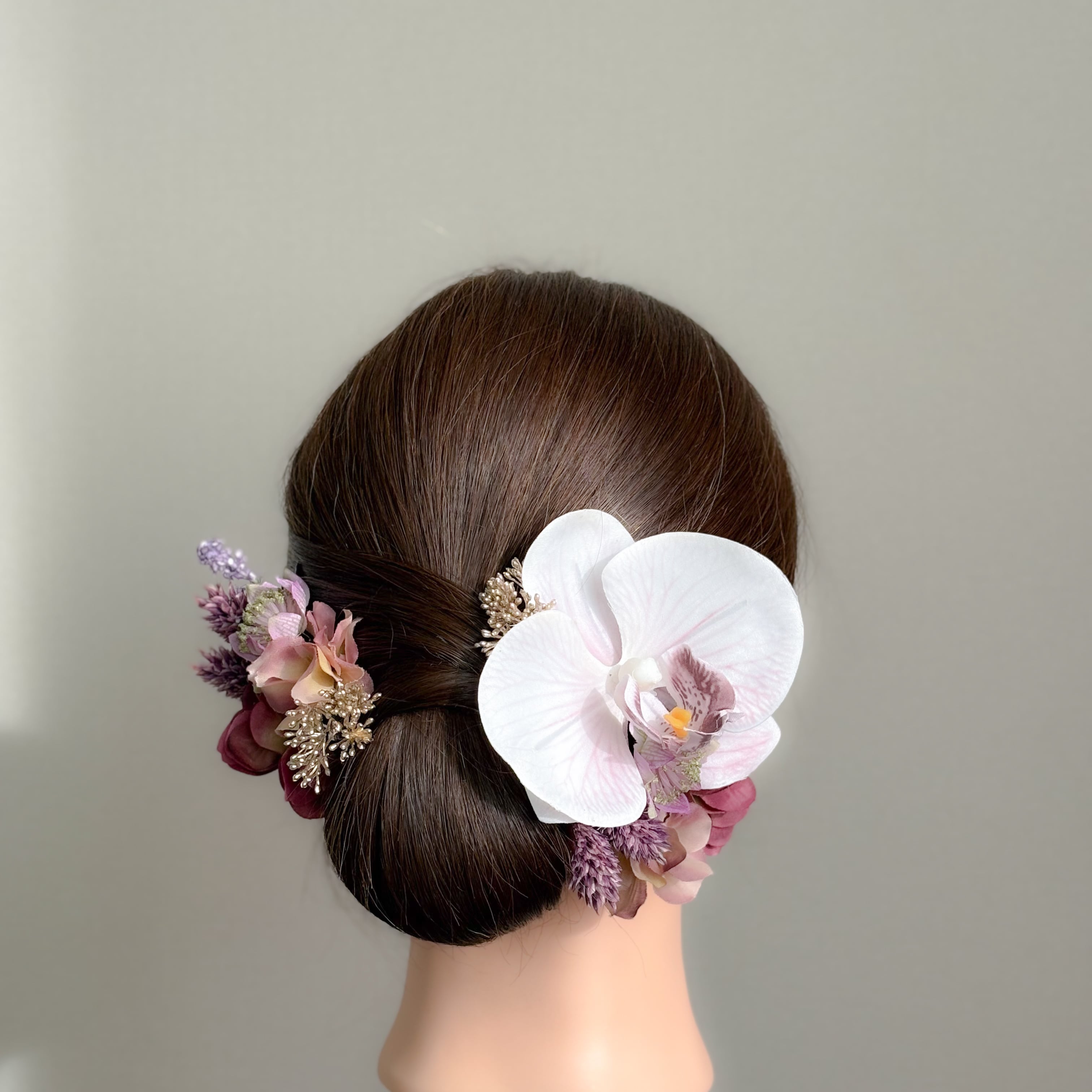 柔らかなラベンダーカラーのグラデーションが印象的な胡蝶蘭の髪飾り。